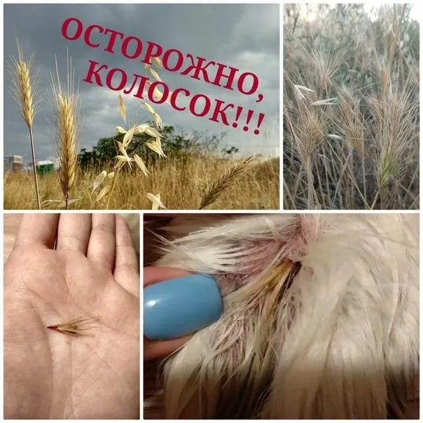 Точно не известно но есть подозрение что "поймали" устюг. Устюг, остюк, овсюг и так далее – все эти термины обозначают высохшую часть растения под названием «заячий ячмень». Зелёные колоски этого растения достаточно безобидны и не способны нанести никакого вреда шерстяному другу. Но по мере высыхания, они превращаются в острые и колючие шипы.