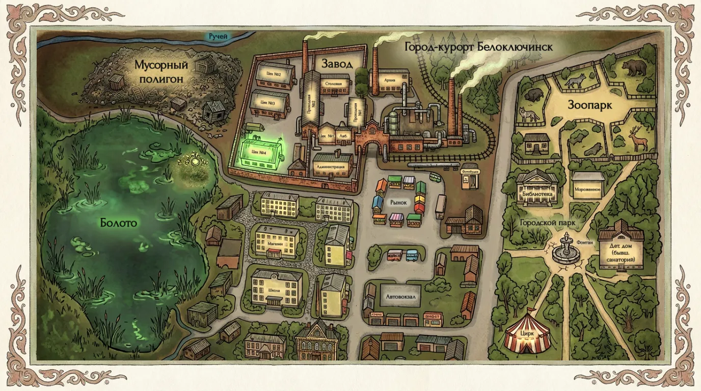 Пригляделся Иван — а на карте, поверх напечатанного, кто-то рукой чертил. Небрежно, торопливо, а видно — старался. И всего одна отметина: один из заводских цехов закрашен зелёным фломастером. Больше на карте ничего помечено не было — ни улиц, ни домов, только этот цех.