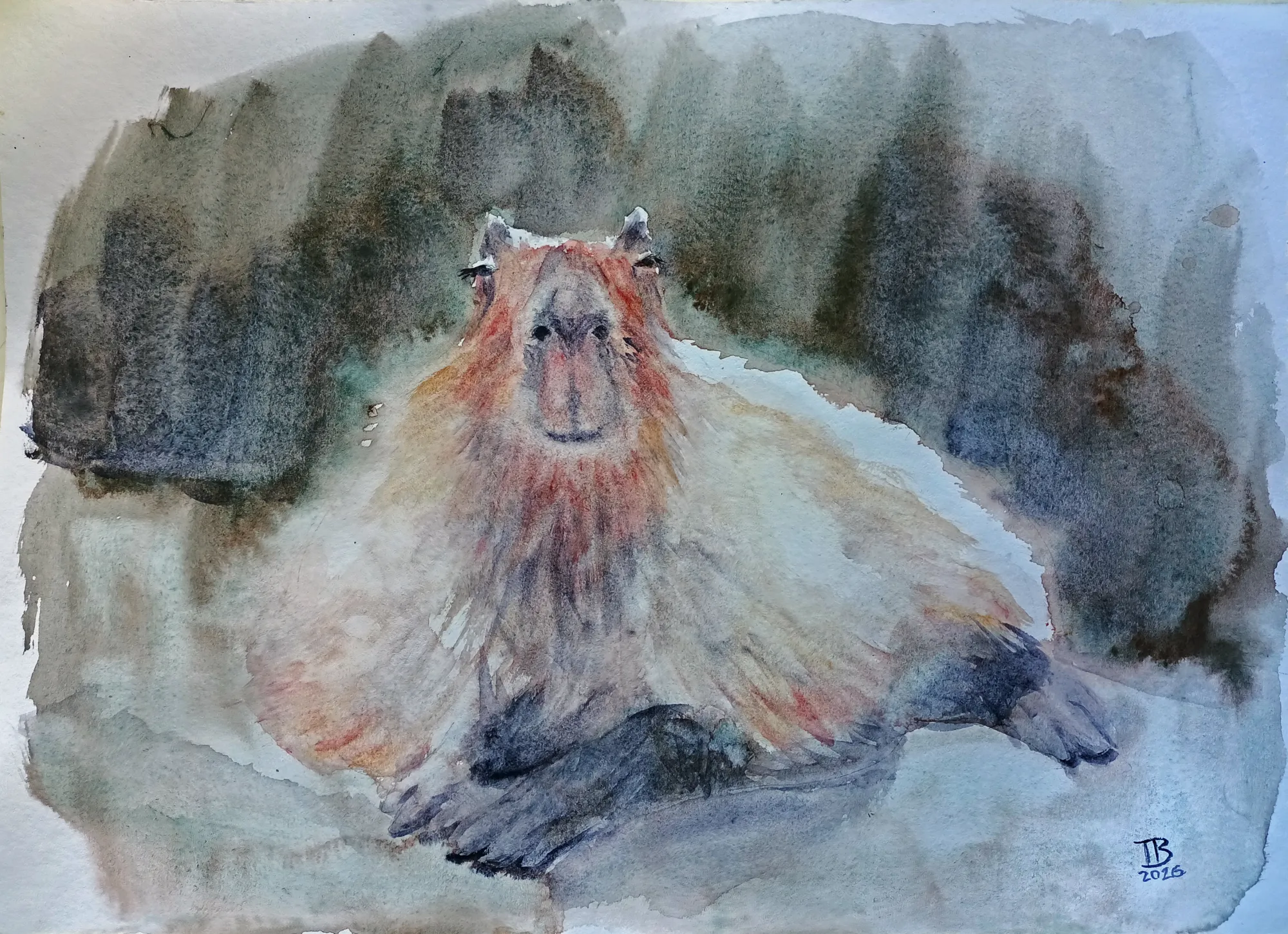 Это не я так назвала, это муж, проходя мимо, сказал: вот это капибааааарища! (она на а3 формате и очень быстро нарисована, его буквально 20 минут не было в комнате, возвращается, а она почти готова, поэтому он знатно офигел от такого быстрого её появления).