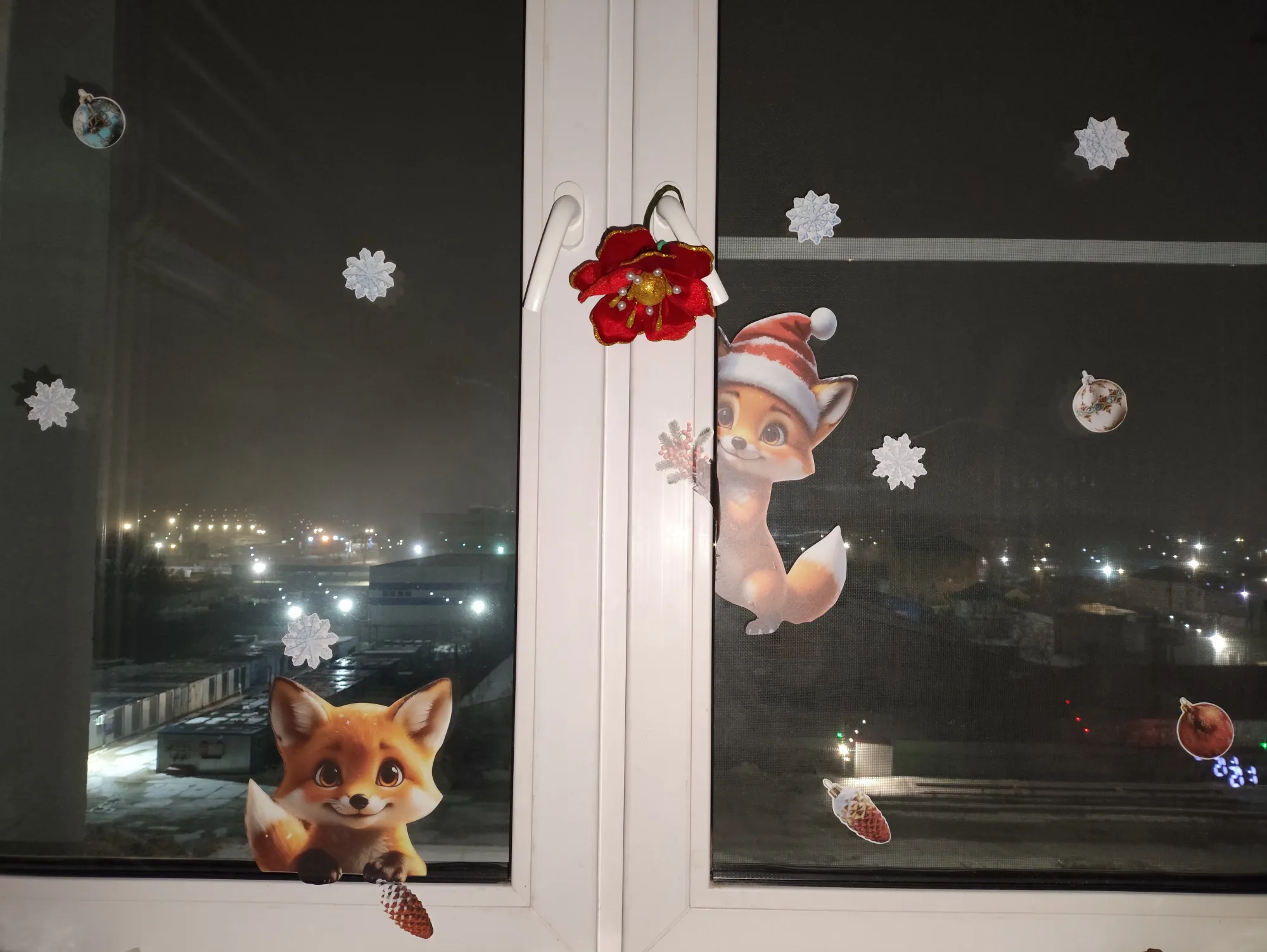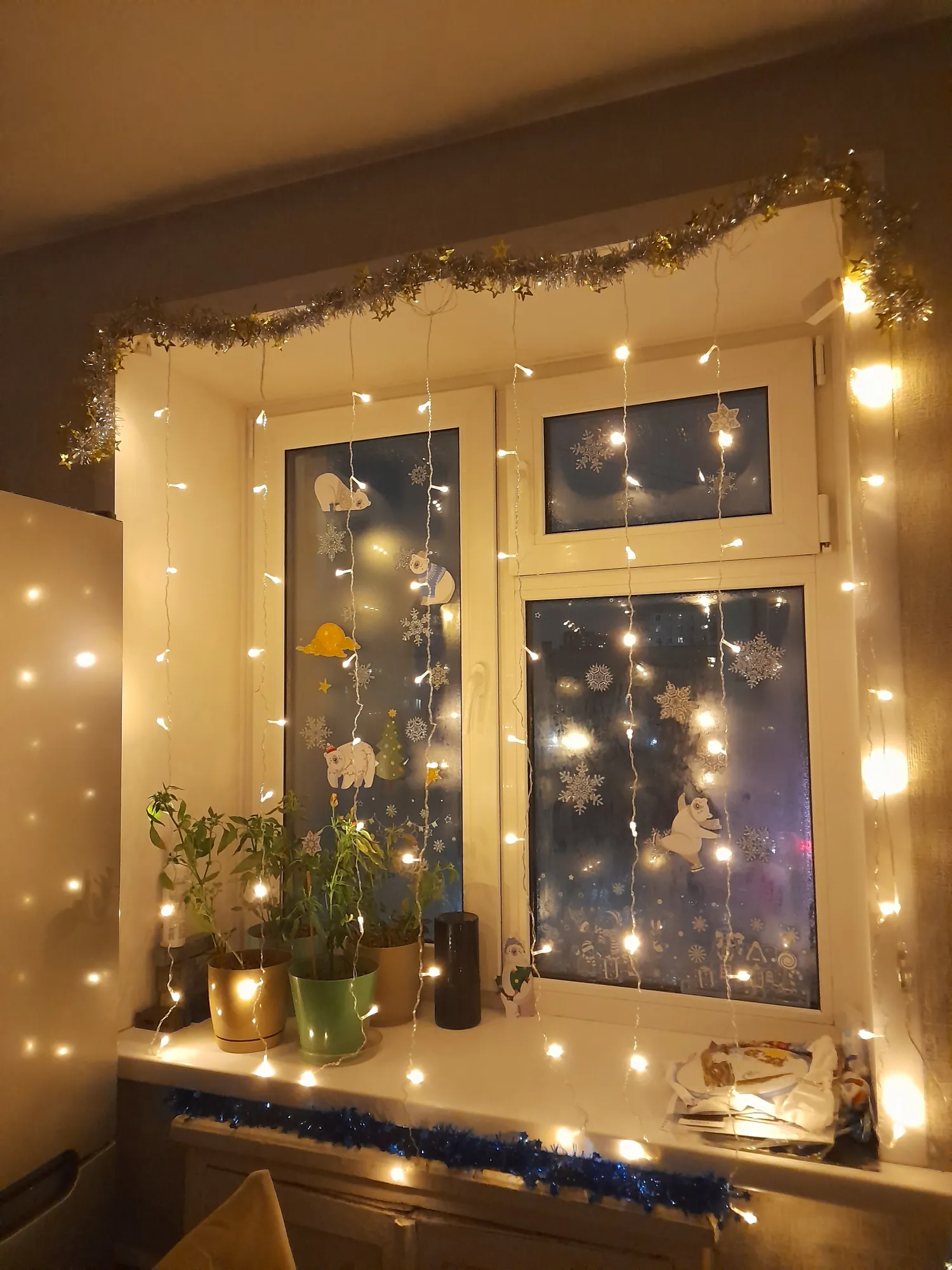 Только сегодня задумывалась о том,что лепить на окно весной и летом) сейчас снежинки и всякая новогодняя штука, пока вот такой вариант понравился. Дима не одобряет,но стойко терпит)