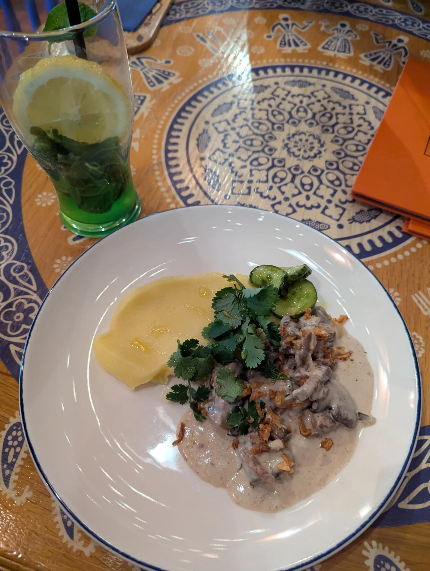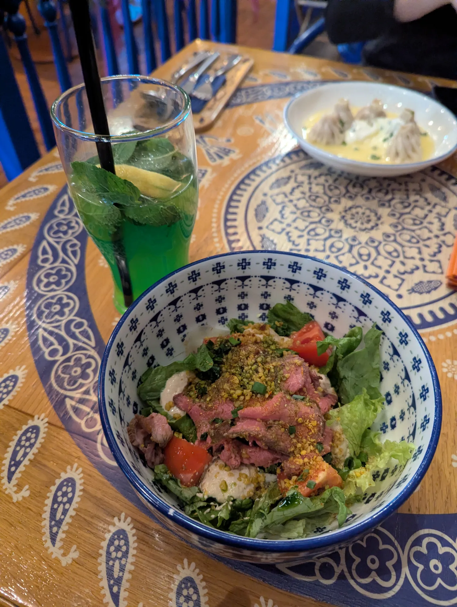 За салат, хинкали, бефстроганов, печеную картошку, пончик и 2 лимонада.