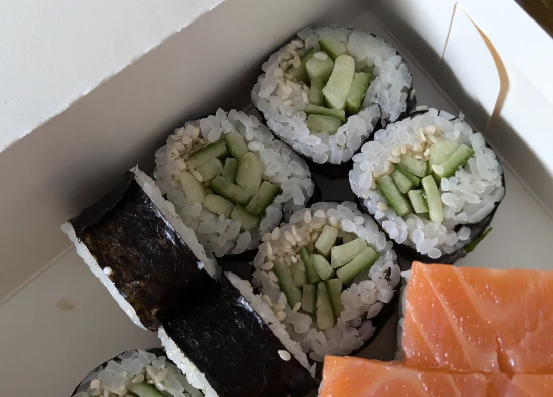 А это моя извращённая любовь – огуречные роллы. Сестра всегда как на дуру смотрит, когда их беру :D