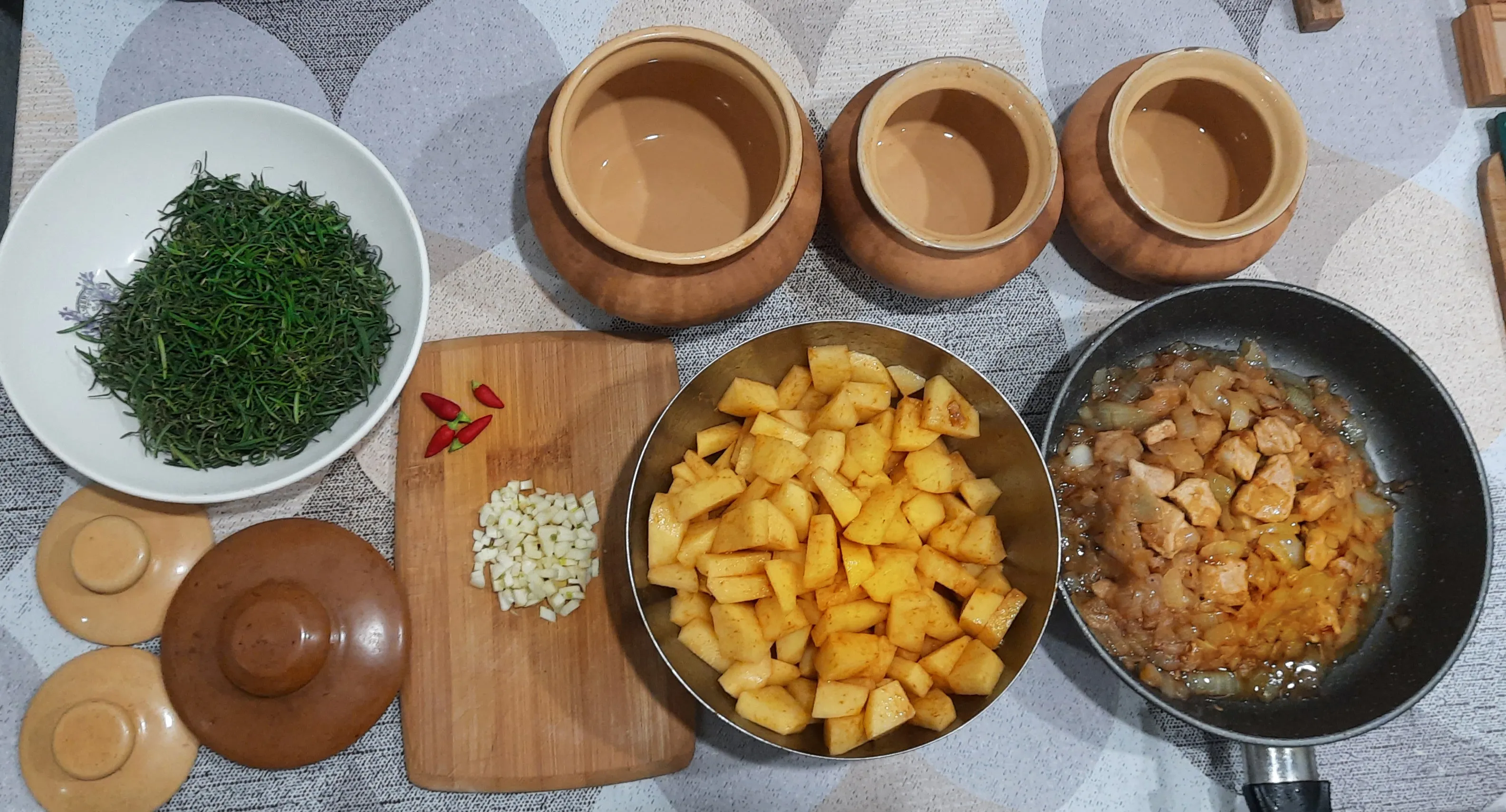 Все ингредиенты готовы. Раскладываем по горшочкам. Солим по вкусу.