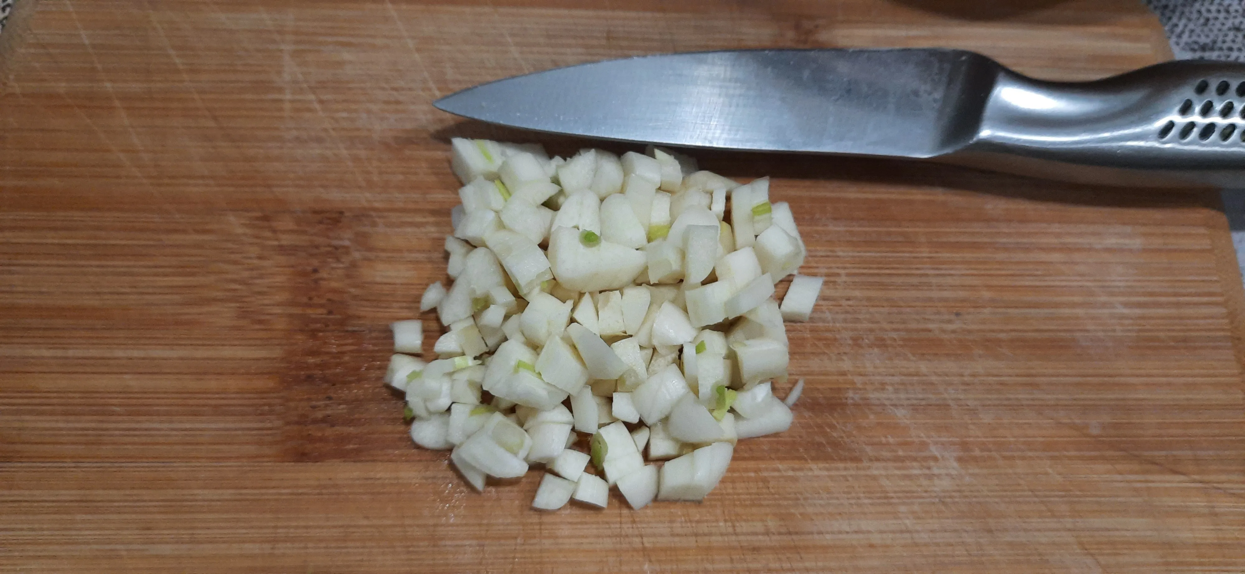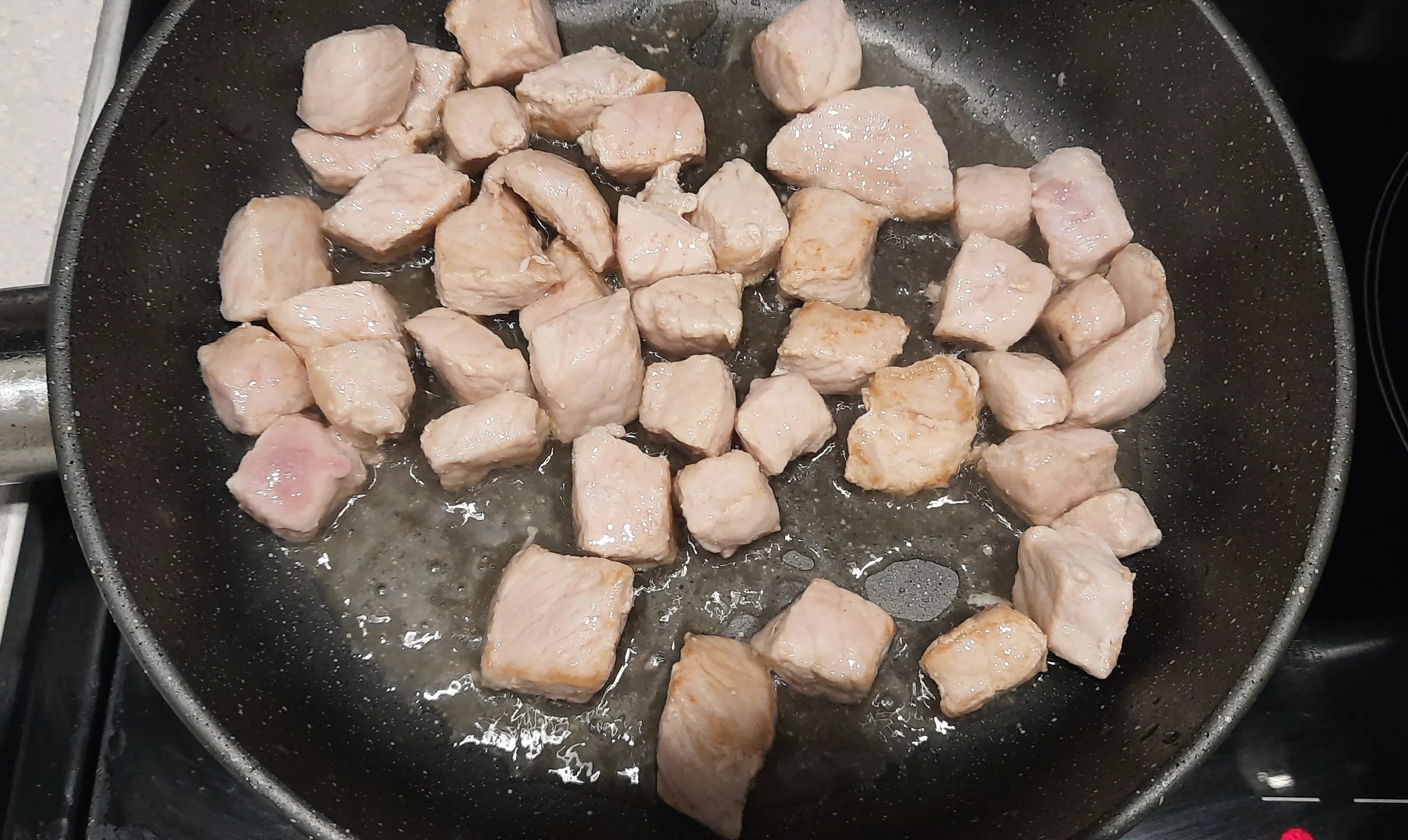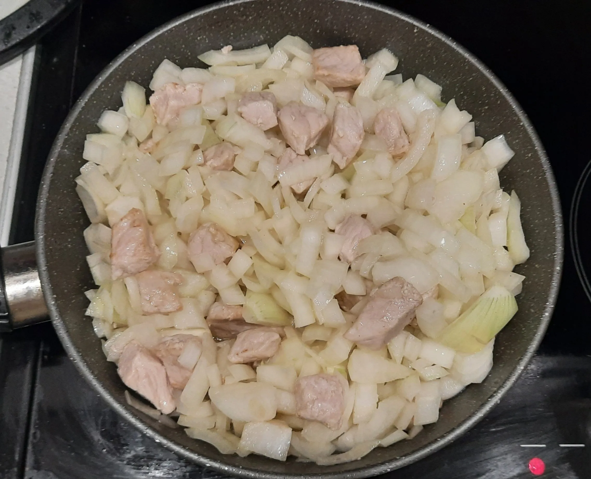 Я срезал с антрекотов сало и начал растапливать его на сковороде. На вытопленном жире буду жарить лук и нарезанную кубиком свинину. Если у вас мясо без сала - просто используйте масло.