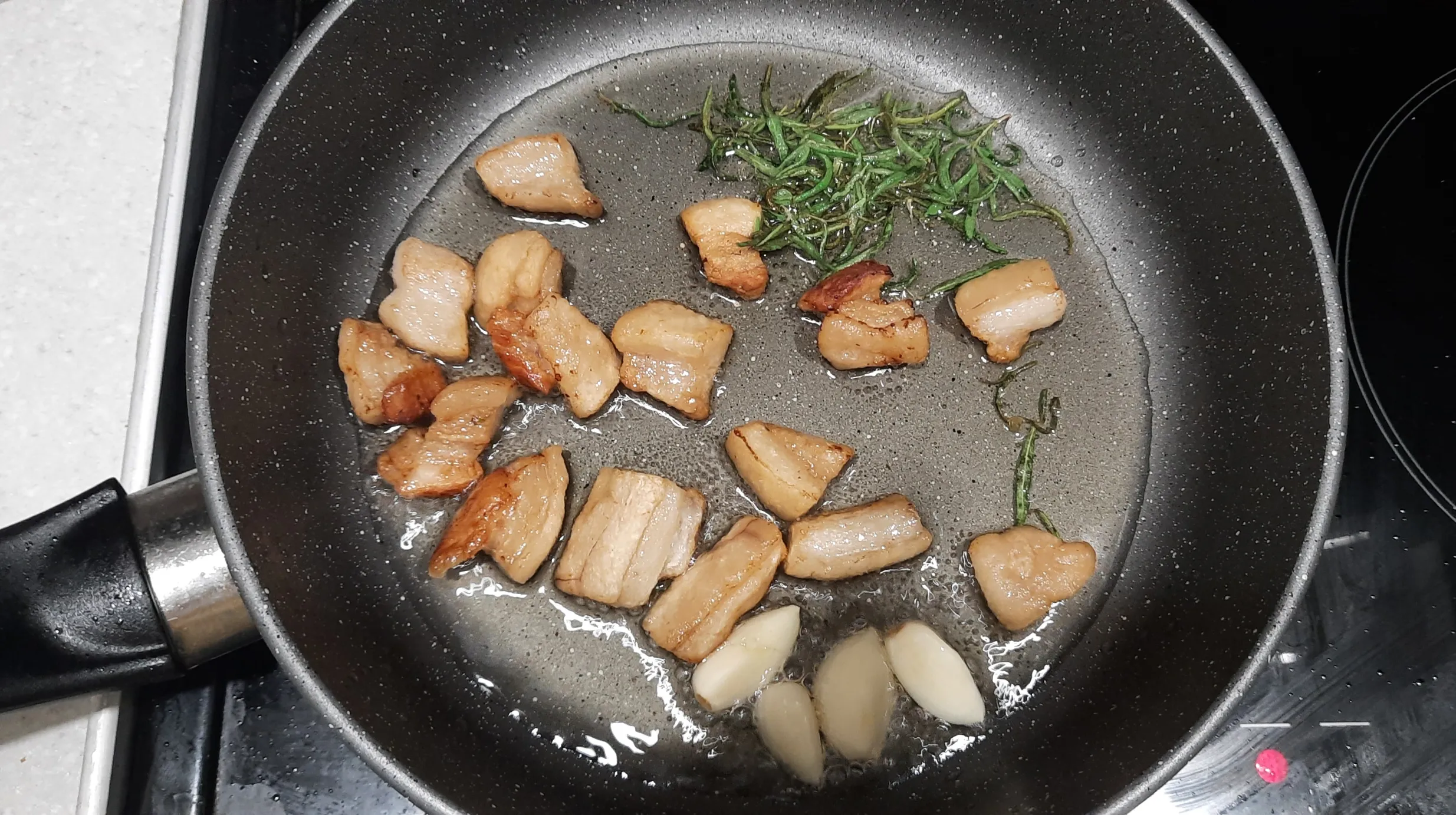 Вытопленное сало, чеснок, розмарин, выкидываем, а на получившемся ароматизированном жирке обжариваем мясо.