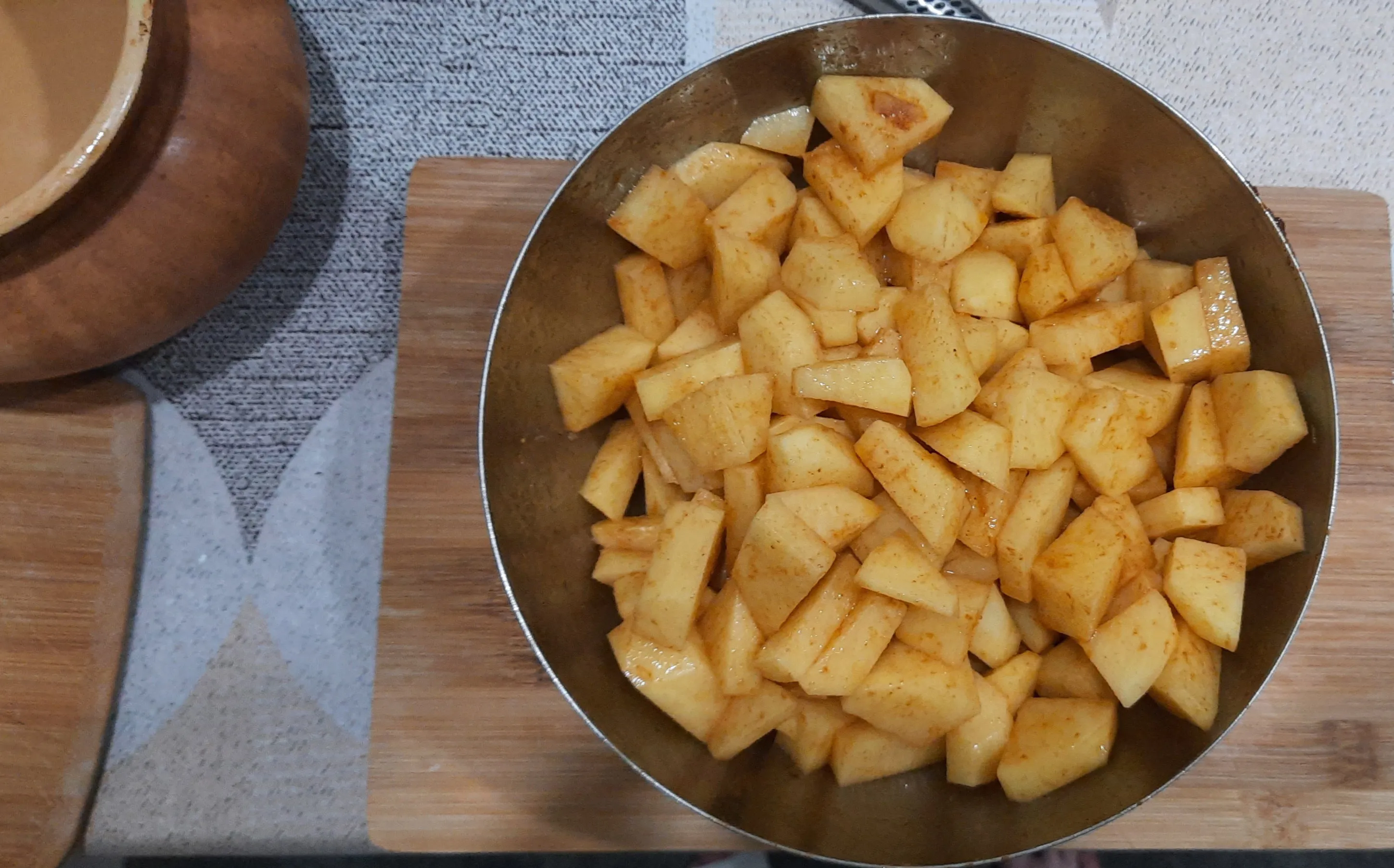 Подготавливаем картофель. Режем его кубиком, добавляем немного растительного масла, пару столовых ложек паприки, обычной или копчёной - перемешиваем.