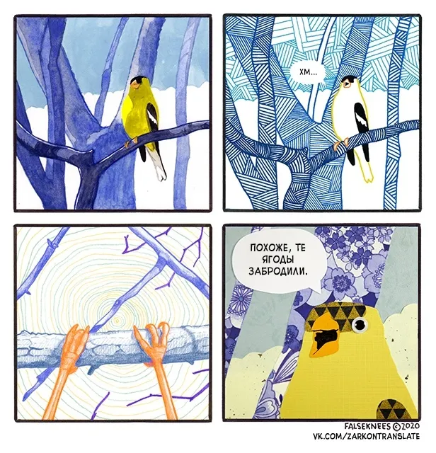 Вот смотри. Все в природе логично. Поползень — ползает. Глухарь — глухой. Сорока — стрекочет, рак — свистит. А снегирь? Что он делает? Он, нахуй, снегирит? Нет. Он просто сидит на ветке и красногрудо пялится на всю хуйню, как будто он только что прилетел из дурдома и ему тут всё охуенно.