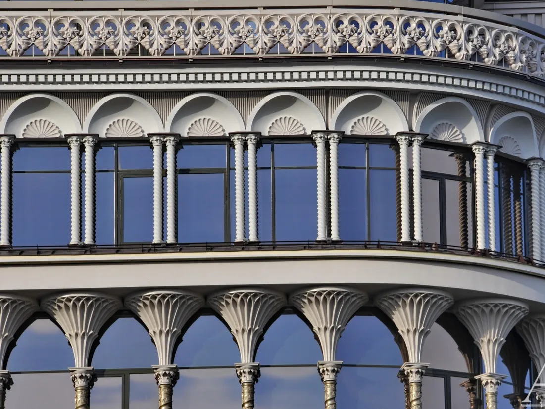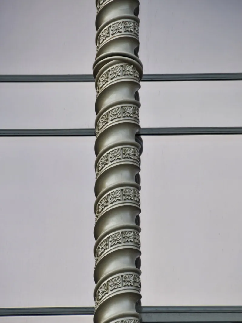 Фасад «New Готики» украшен резными спиральными колоннами, непропорционально тонкими, что делает строение визуально легким и стремящимся ввысь.