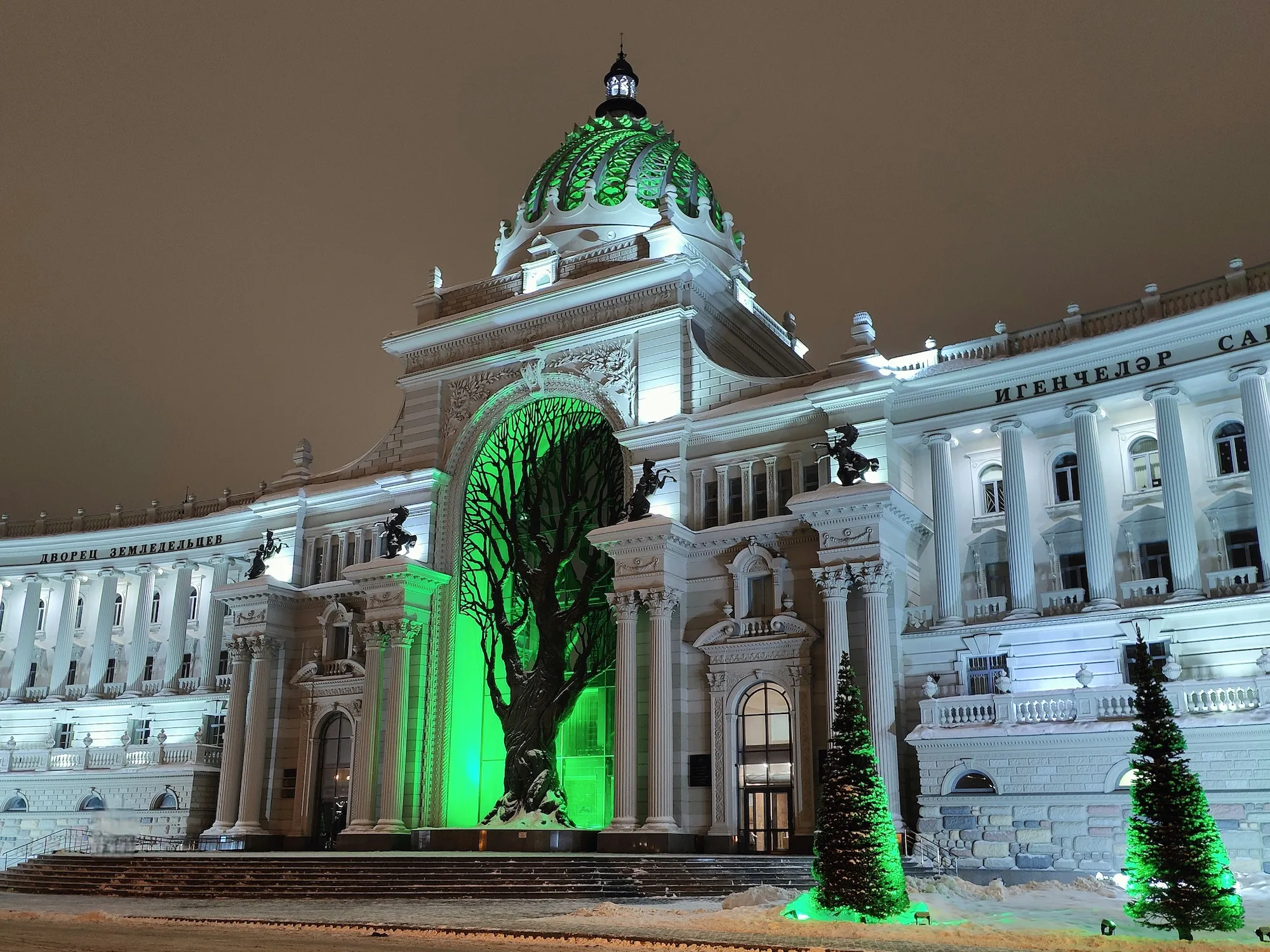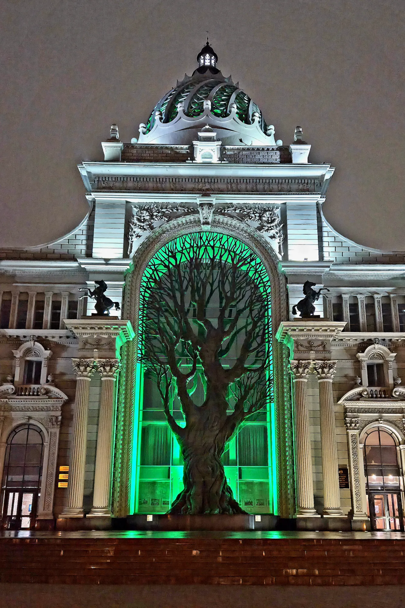 20-метровое дерево у входа во Дворец — это древо жизни, взятое из библейского сюжета. Оно символизирует саму жизнь на Земле, красоту природы, её воспроизводство и возделывание, что близко тематике сельского хозяйства.