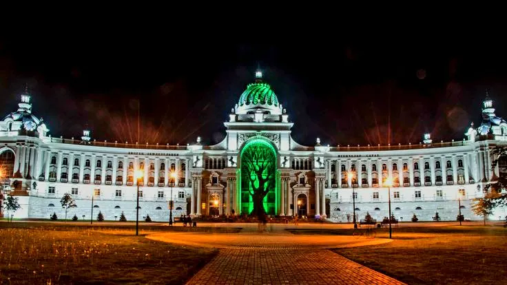 Главной изюминкой дворца является его световое оформление, открывающее всю пугающую величественность здания. Но оценить ее можно только ночью