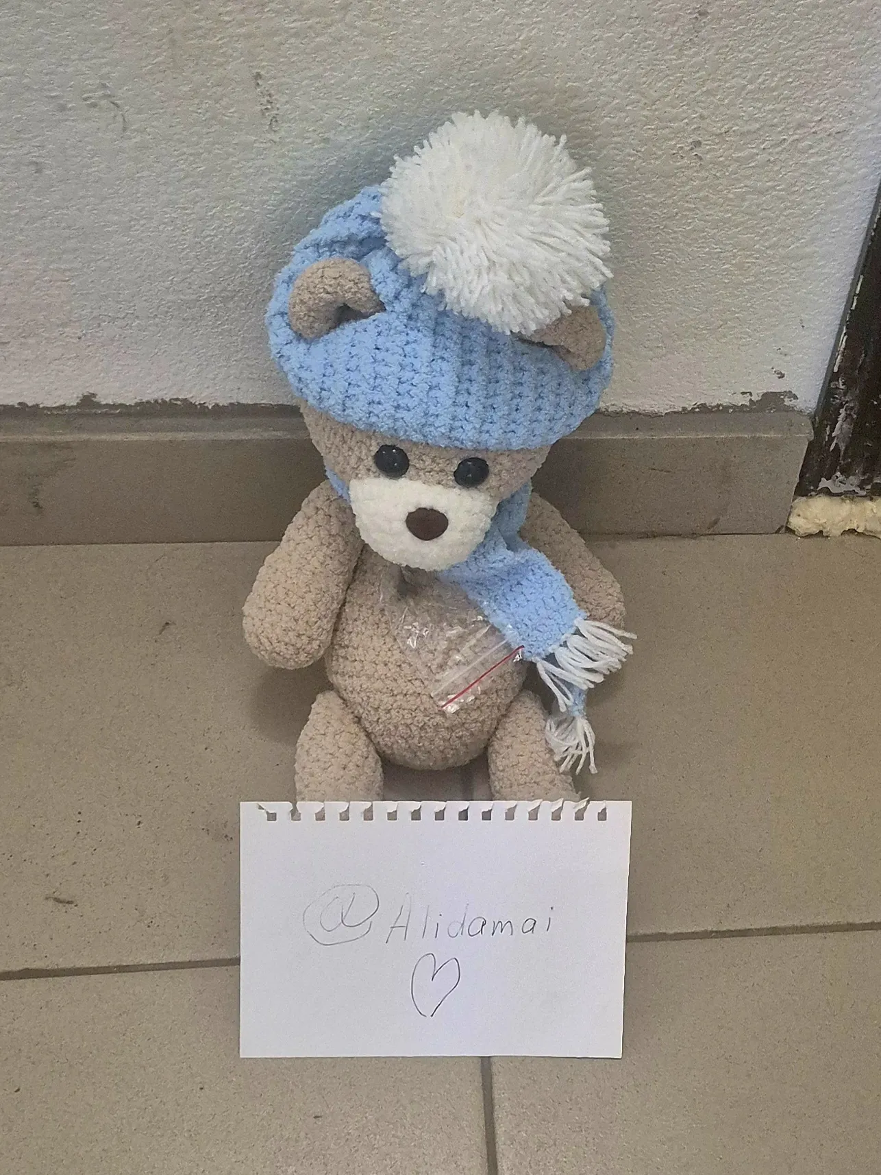 @jewellerpotato подложила под свою же дверь милого вязаного медвежонка.