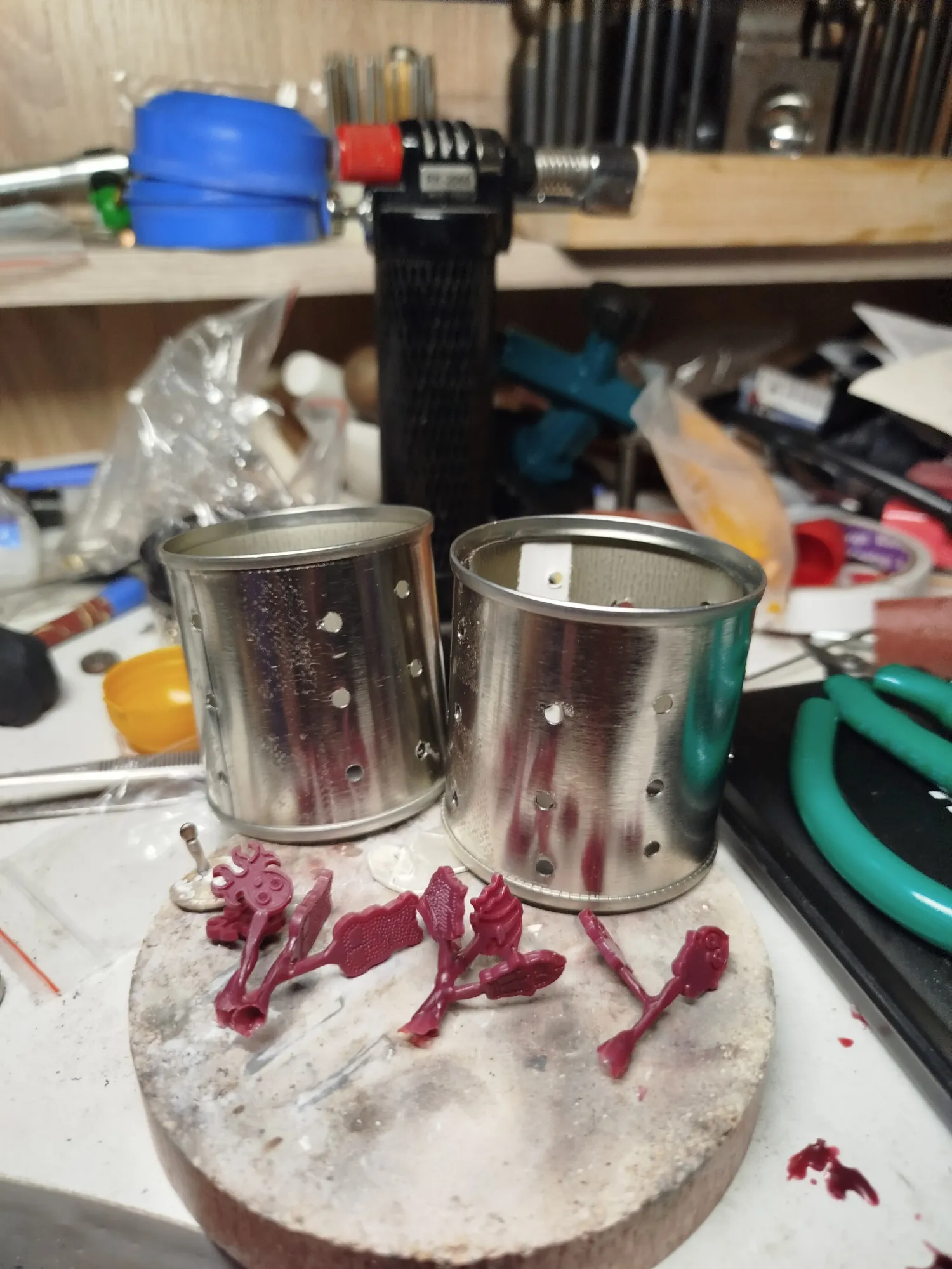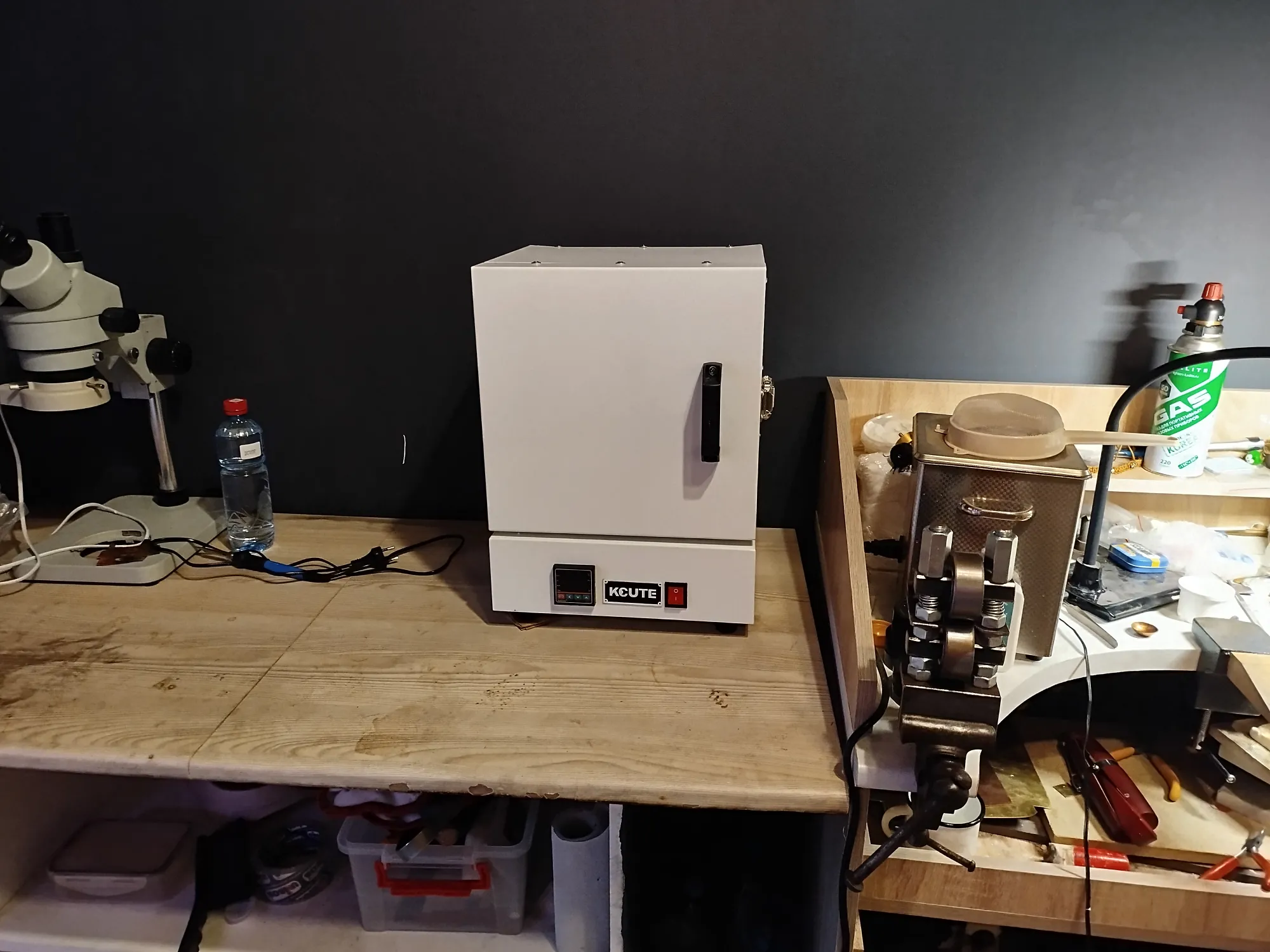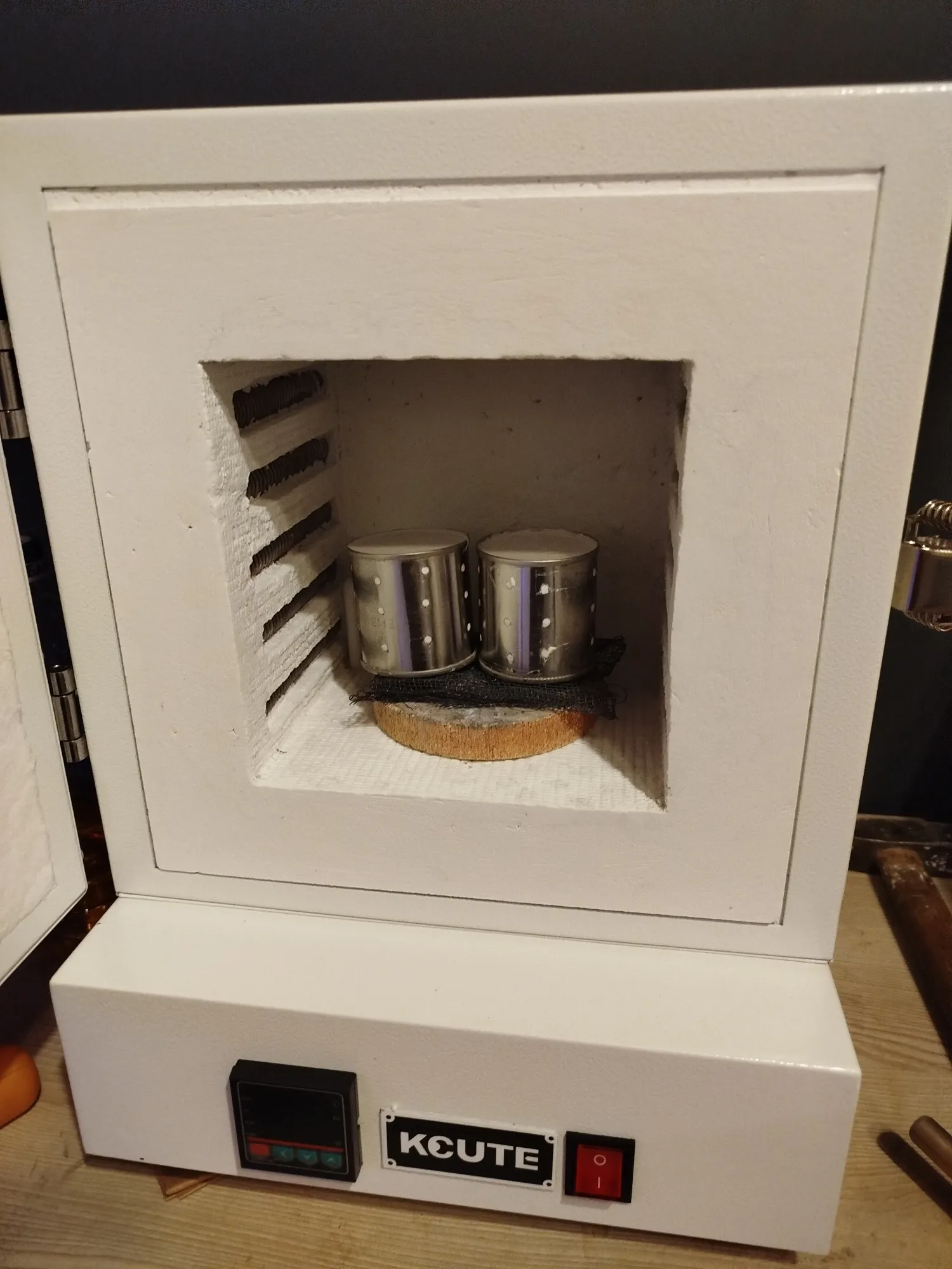 В принципе, туда влезло бы и 4 таких опоки, но у меня плитка для пайки маленькая, не хотелось загадить новый муфель. Также там видна стальная сетка- для вытопки воска. Поставила опоки, включила и задала простой режим- программатор у меня будет, но сильно позже. Пока хочу вам рассказать о горелке новой- на МАПП газе.