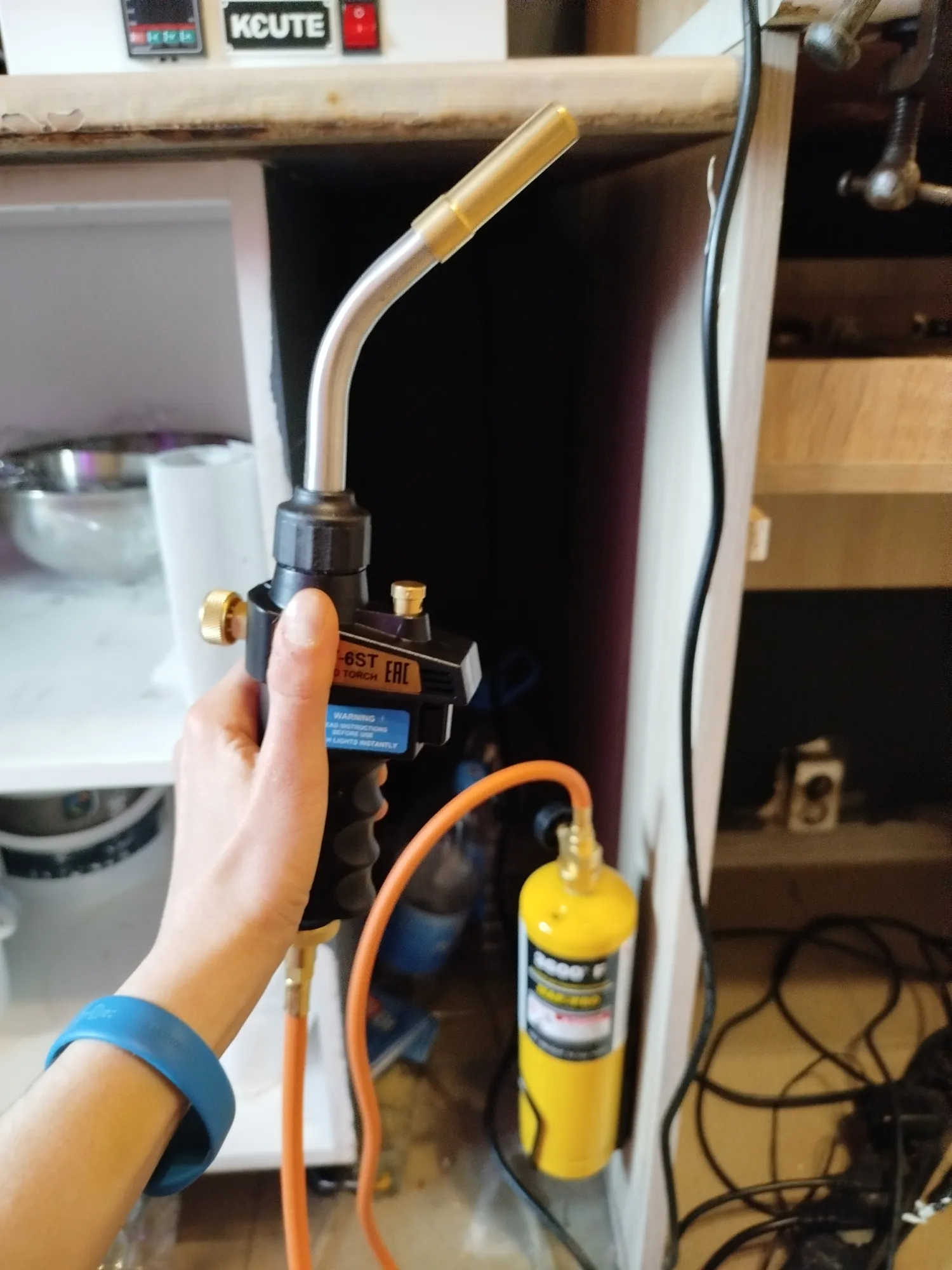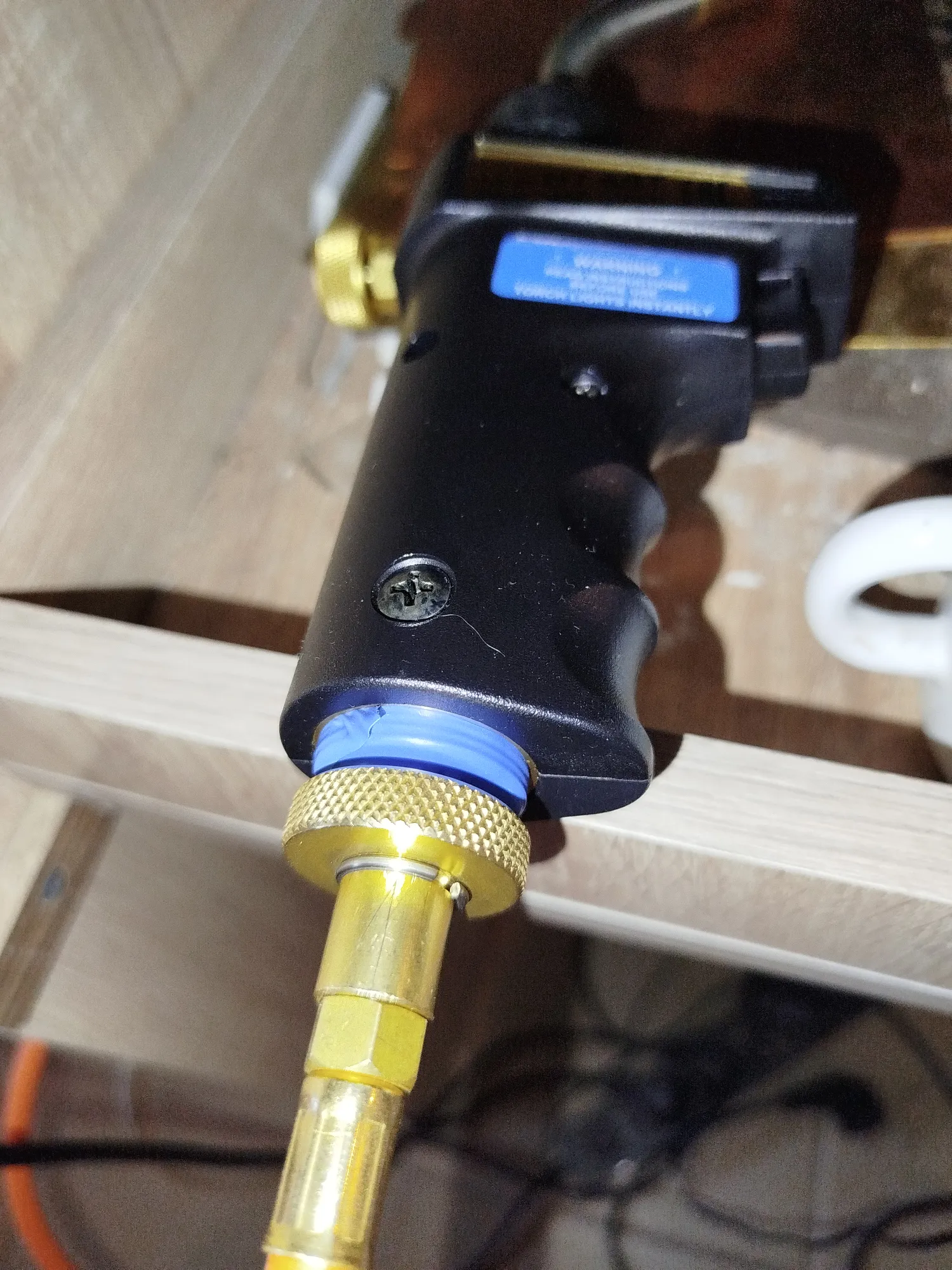 шланга и самой горелки. Можно подключить редуктор, можно собрать без шланга напрямую- но тогда при наклоне боюсь будет травить. Резьбу украсила синей изолентой- так я понимаю мировую гармонию. Проверила места соединения мыльным раствором, ТБ НАПИСАНА КРОВЬЮ!
