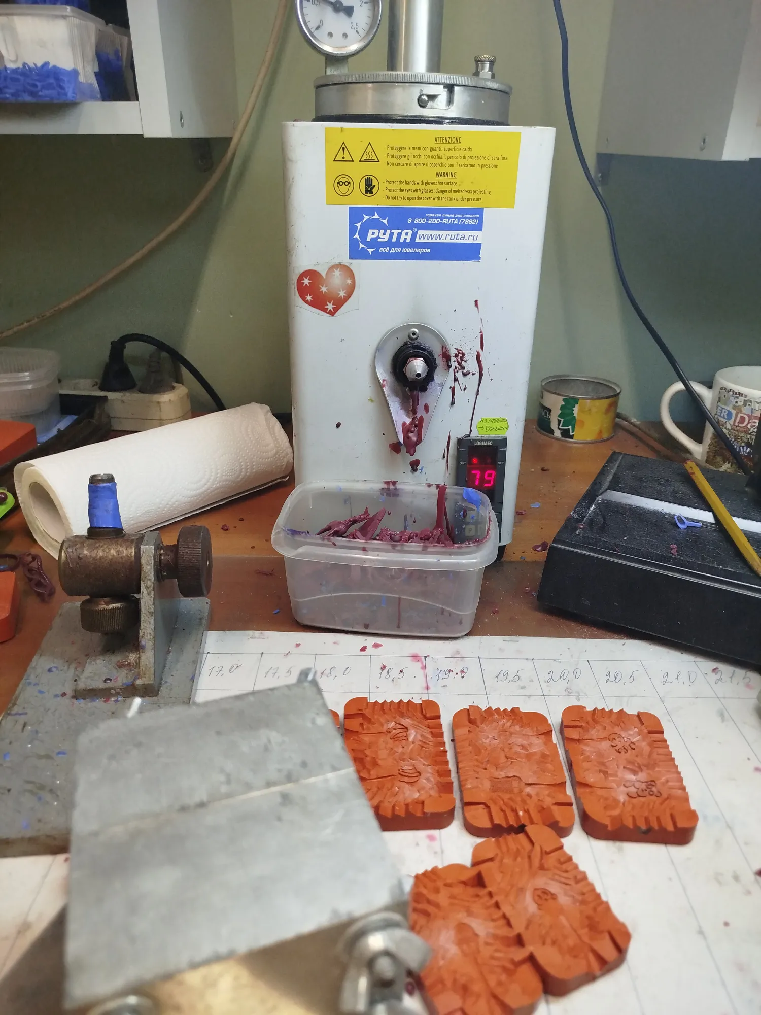 Восковки сделала на работе на ручном инжекторе, резинки резать я не умею. Зато сам воск мешала сама- из красного и синего, очень хорошо получилось, я на сувенирке в этом году с ним работала, мелкая пластика отлично видна.