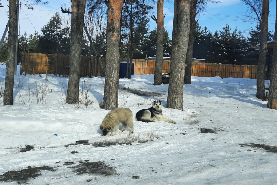 это всё дворняги с территории первого дома, где живёт семья целая, вот мужик как раз сторожит. у него там собак 5 где-то в сумме. со всяких шашлыков местные всегда туда кости приносят.