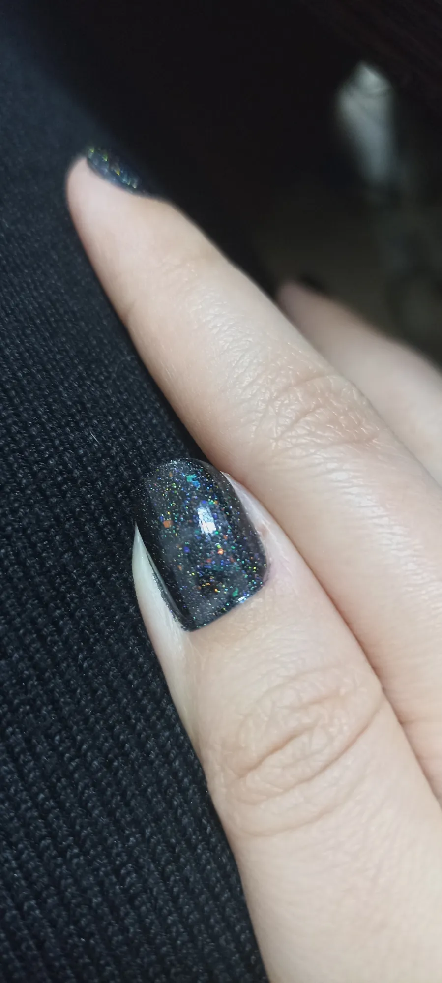 Но на тот момент я негодовала и хотела ещё чистый чёрный. А потом я в него влюбилась. Он закончился. И больше я такого ни разу не встречала. Всё, шо было похожее с виду - оказывалось прозрачным. А тот был такой, что один слой наносишь и он вот прям идеальный плотный чёрный и куча блестюх на нём. Прям космос какой-то