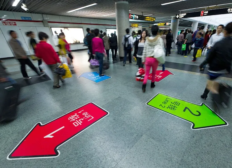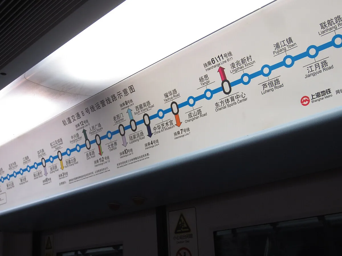 6) Часы пик в шанхайском метро отличаются резкой неравномерностью пассажиропотока — в этом оно контрастирует с московским. Ведь, как мы все знаем, Moscow - never sleep: даже в час ночи у нас в метро довольно людно. В Шанхае же периоды полной загрузки резко сменяются почти полным опустением. С 9 до 10 утра и с 18 до 19 вечера в вагонах не протолкнуться, но уже к 20:00 город будто замирает — станции и поезда пустеют. Мы как раз в это время ехали из аэропорта (наш трансфер сгорел вместе с пропущенным рейсом) и были поражены полнейшим безлюдием в метро.