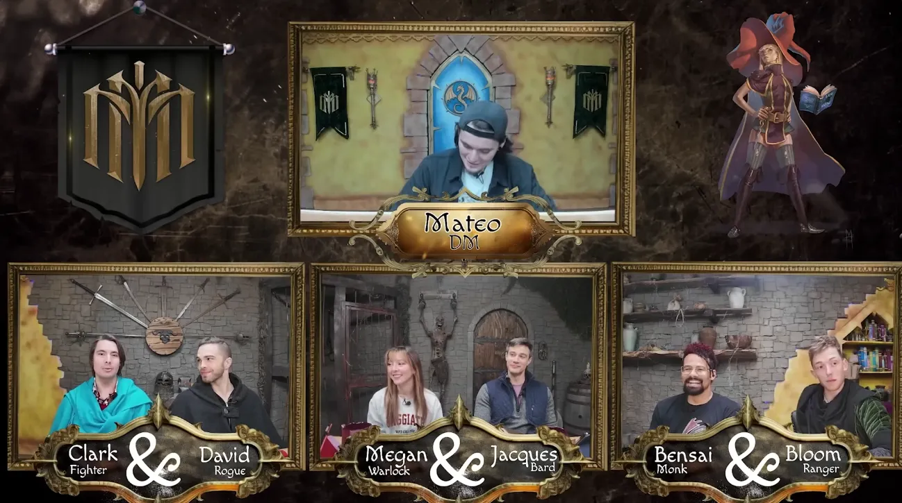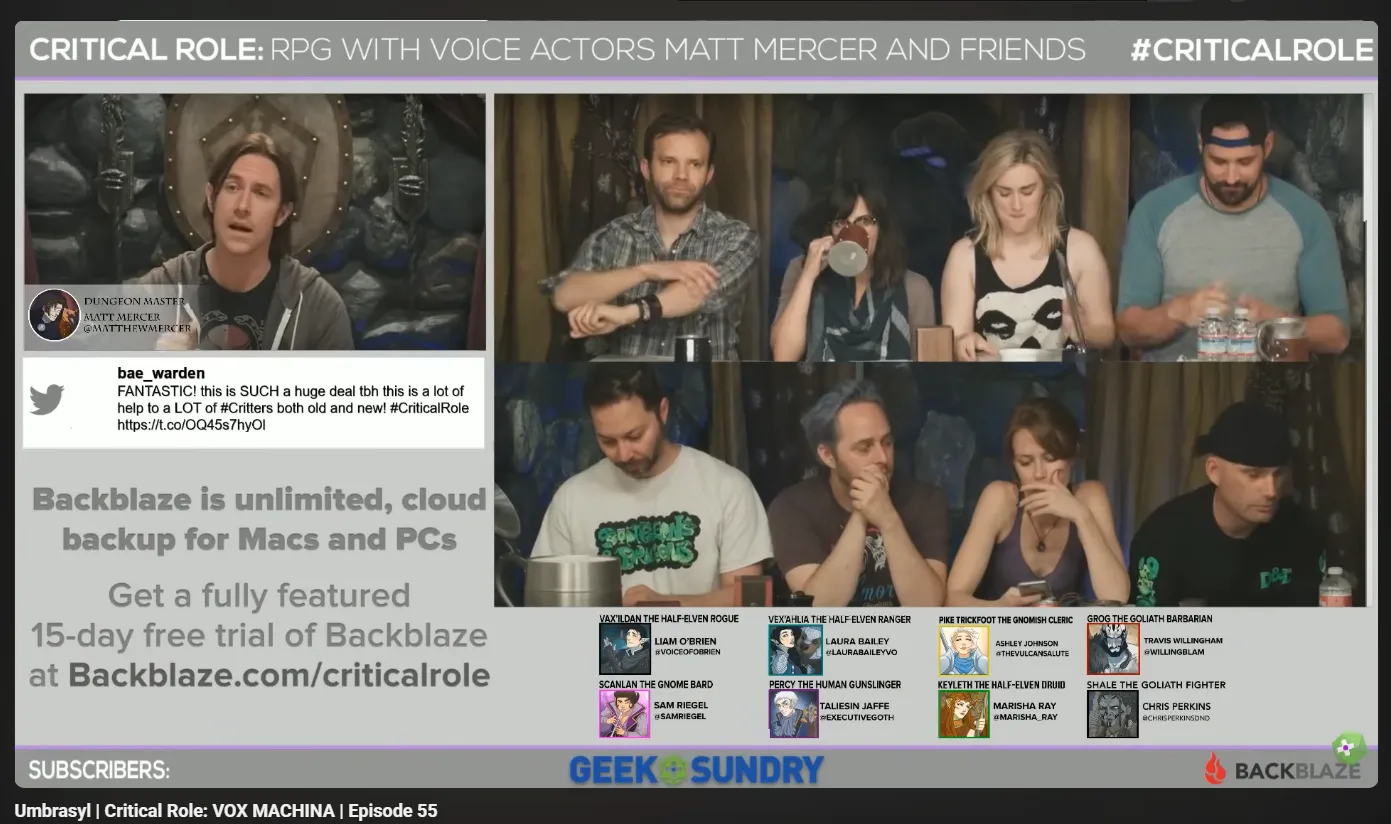 - Темплейт трансляции выглядит так, будто они находятся в разных помещениях и созваниваются по дискорду, сидя на зелёном фоне. Это невольно приводит к негативным ассоциациям с рандомными ДнД-шниками-удалёнщиками с Твича, которых смотрят полтора человека. В самых успешных проектах обычно все игроки и стол видны в одном кадре, или пати разделена на две камеры. Если у вас живые посиделки за одним столом, зачем уподобляться форматам удалённых игр?