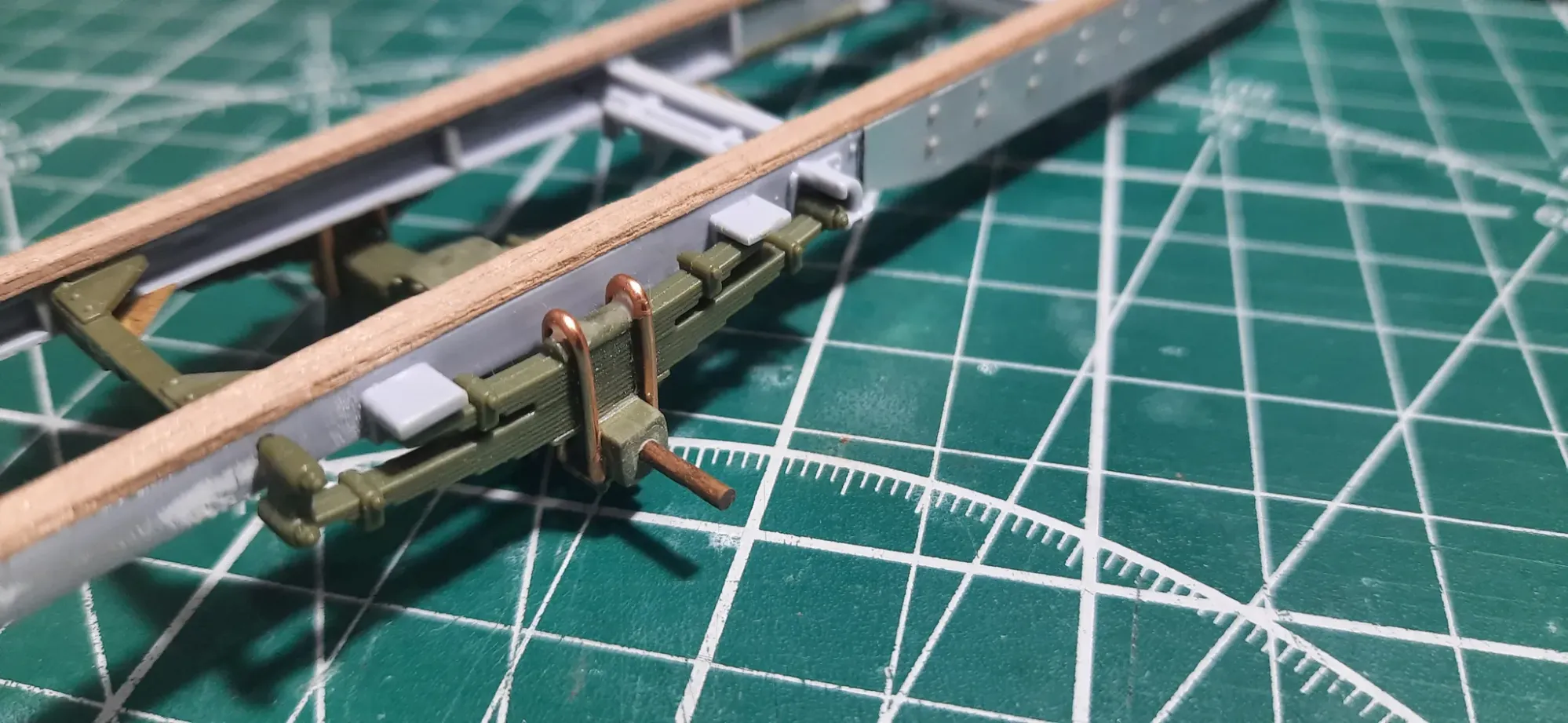 Рессоры оставляем из набора фирмы Звезда. Стяжки моста с рессорами, а так же оси колёс я решил заменить на проволоку. Так смотрится более натурально.