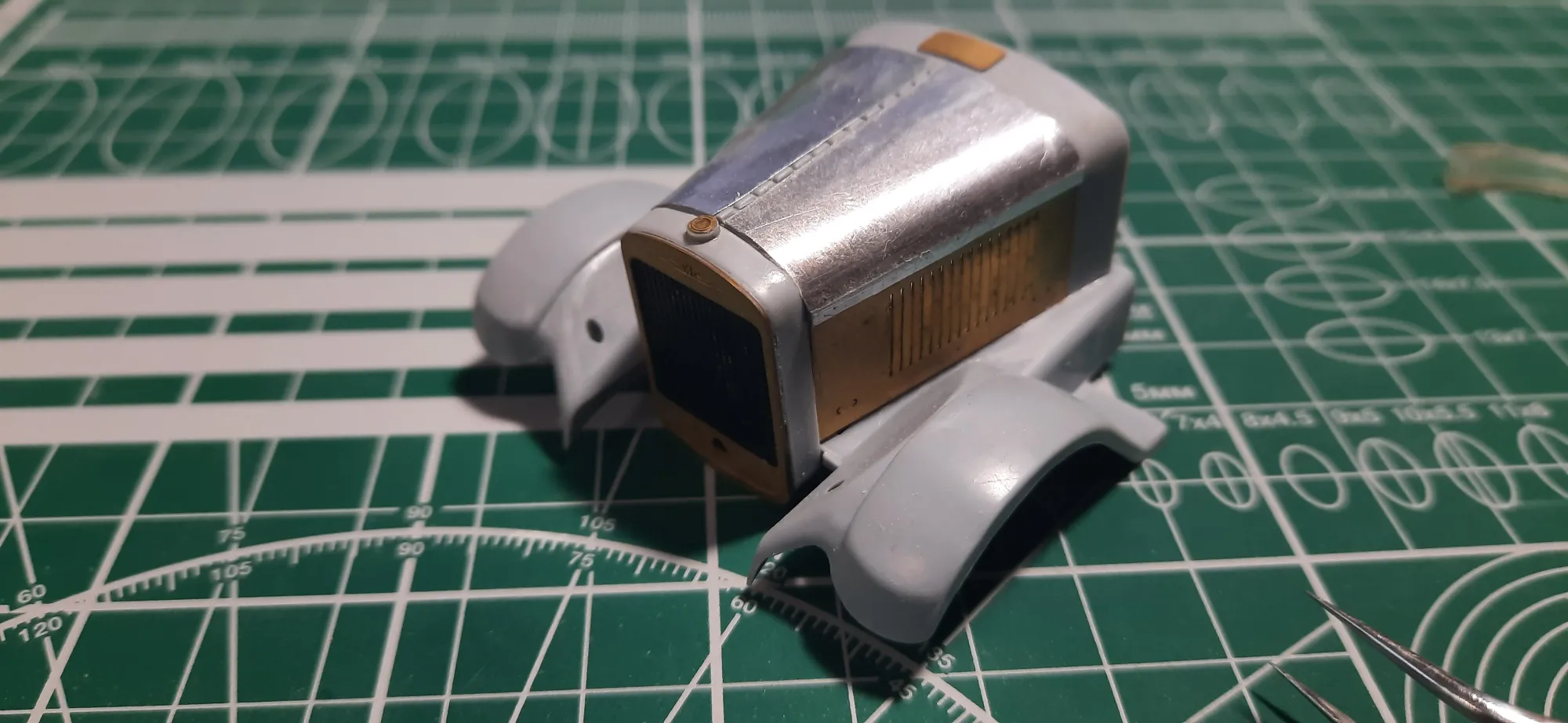 Сделал крылья и капот с решёткой радиатора. Пришлось отрезать часть кабины, которая была отлита заодно с крыльями и капотом. Ведь задняя часть морды грузовика и автобуса абсолютно разные.
