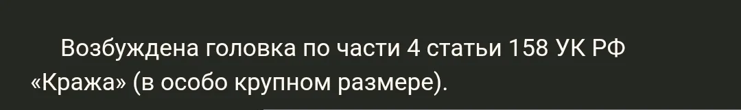 Возбуждена уголовка по части 4 статьи 158 УК РФ «Кража» (в особо крупном размере).