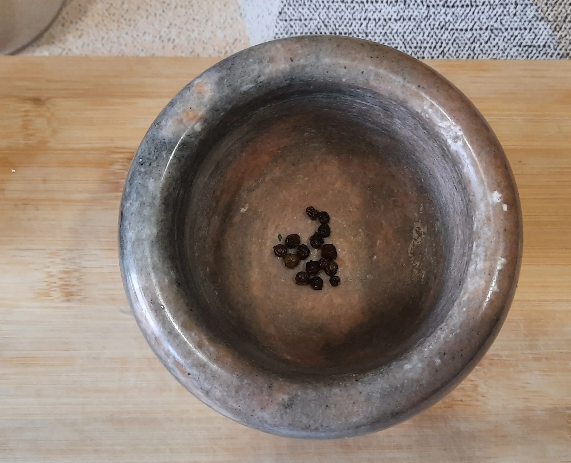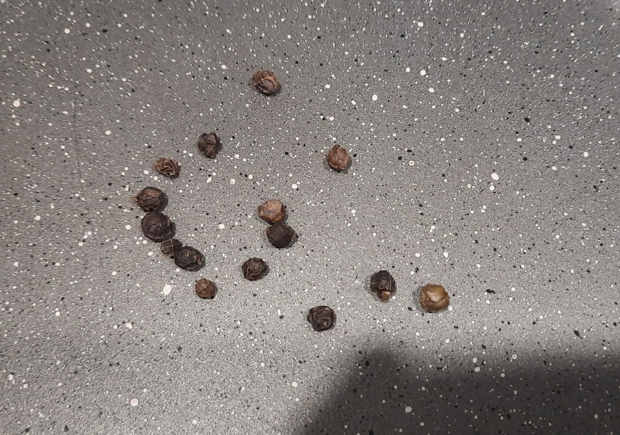 Убираем капусту в тарелочку, ставим на подоконник, чтобы остывала. Сковороду протираем и на сухой разогретой сковороде обжариваем несколько горошин чёрного перца.