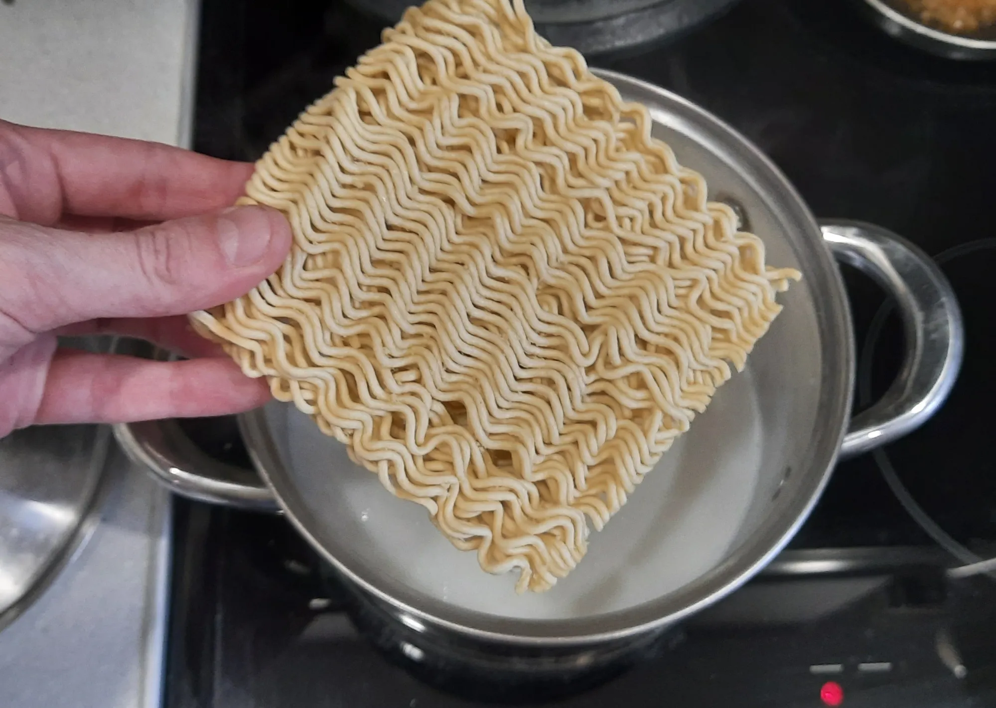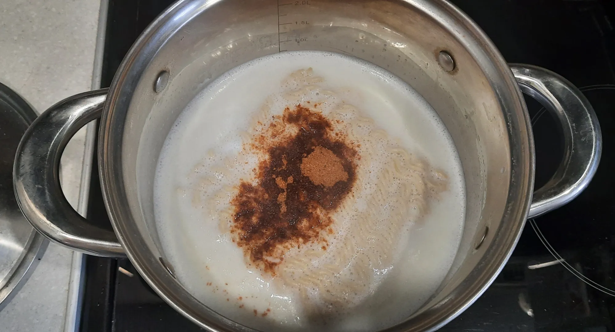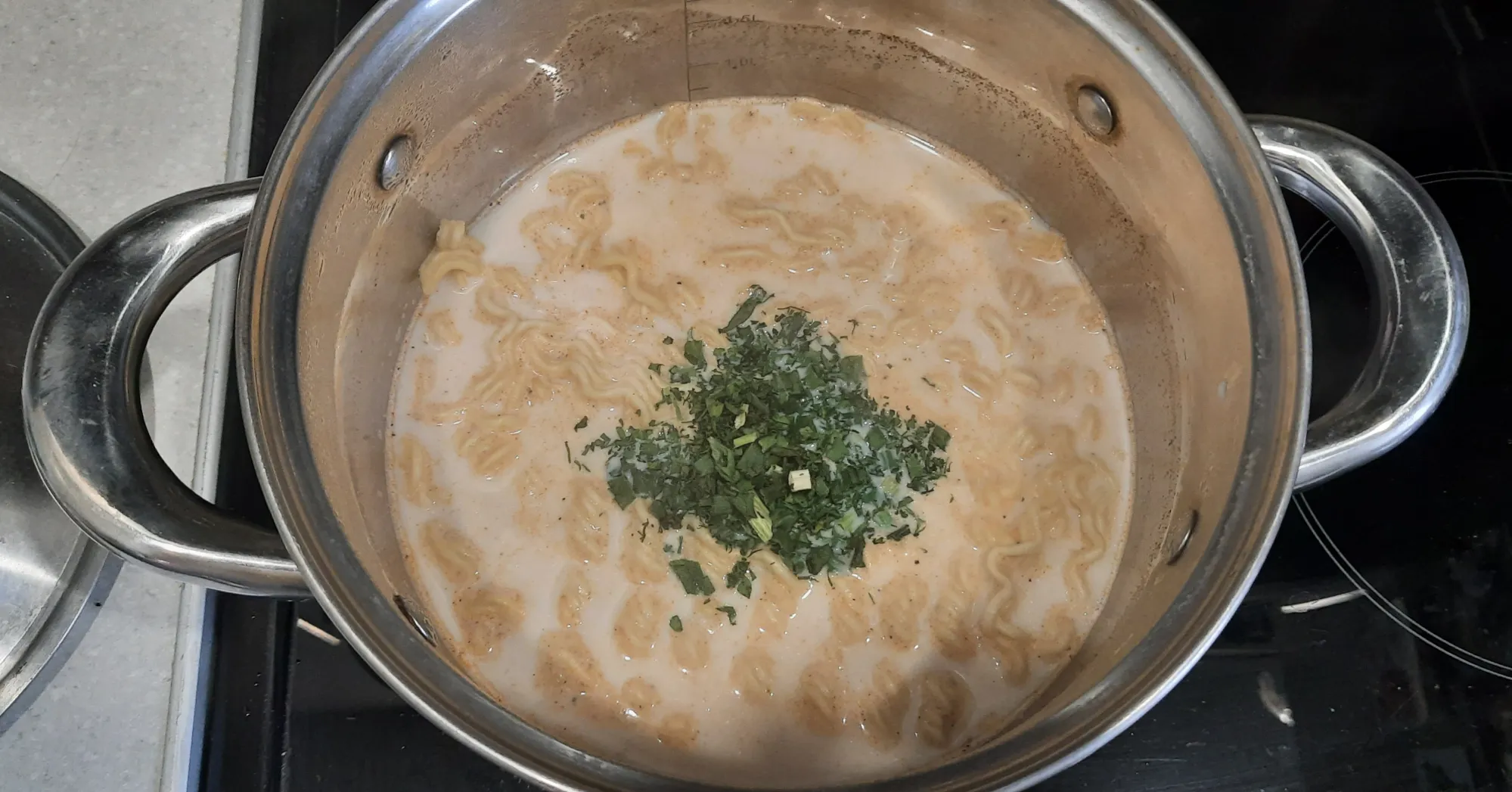 Смешиваем 400 мл молока и 200 мл воды. Отправляем в кастрюлю. Доводим до кипения. Кидаем туда бичпакет. Дошираковский Чанжан мён. Но заводскиек приправы я использовать не стал. Только лапшу.