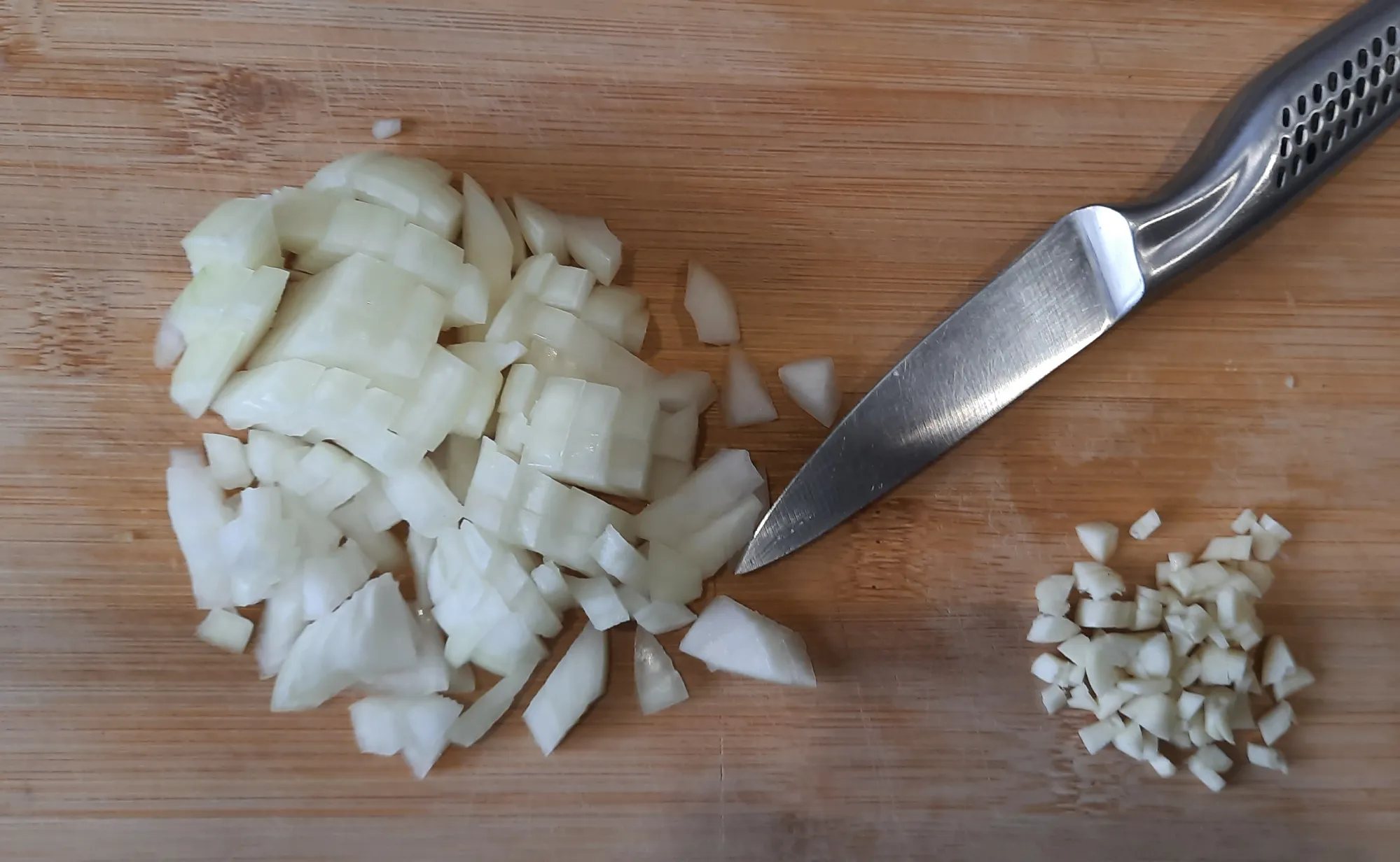 Нарезаем две небольших домашних луковицы и пару-тройку зубчиков чеснока