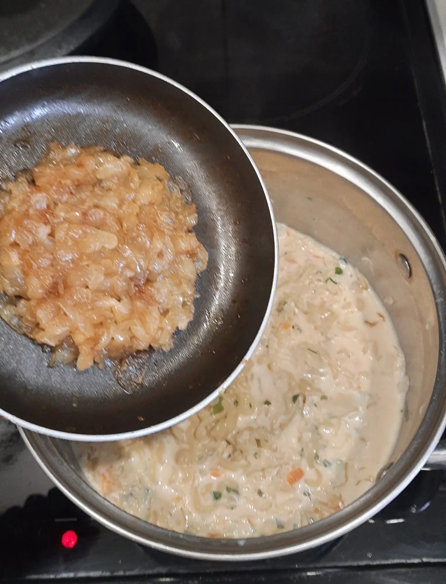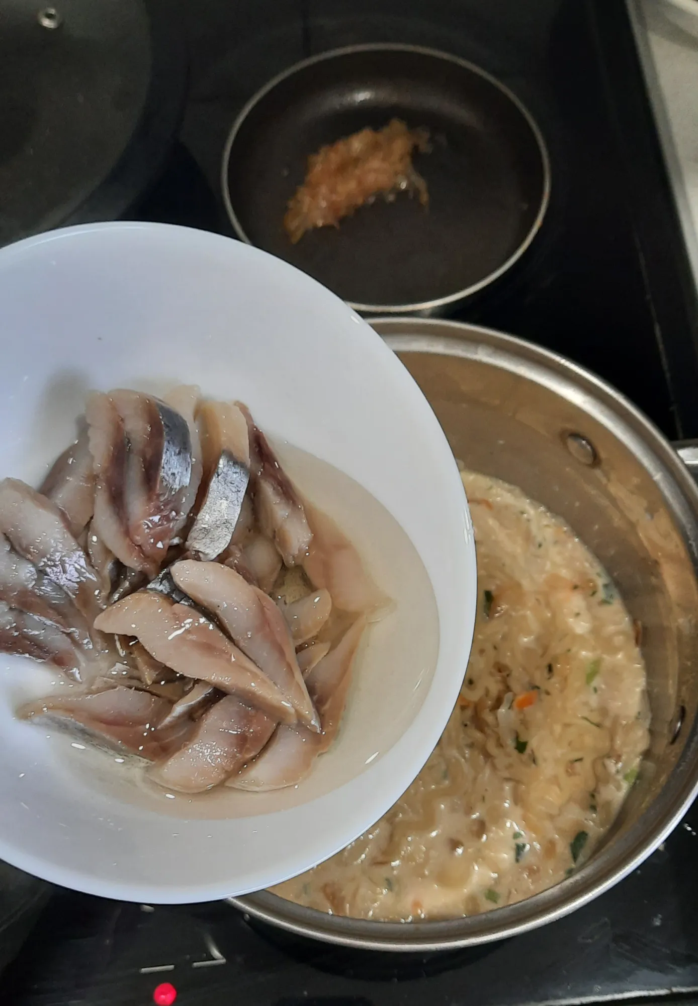 Ну что я могу сказать...Это гораздо лучше, чем я ожидал! Особенно с зелёным луком прям неплохо. Вкусы очень яркие. Сочетание необычное и немного обескураживающее. Весьма сильно ощущается рыба. Она перекрывает сливочность молока и карамелизованный лучок, хоть я добавил её не столь много. Я не большой любитель рыбных блюд. Поэтому второй раз, думаю, готовить такое не буду. Но, это было очень интересно и необычно!!! Спасибо Насте и остальным смельчакам, что мотивируете пробовать что-то новое!:)