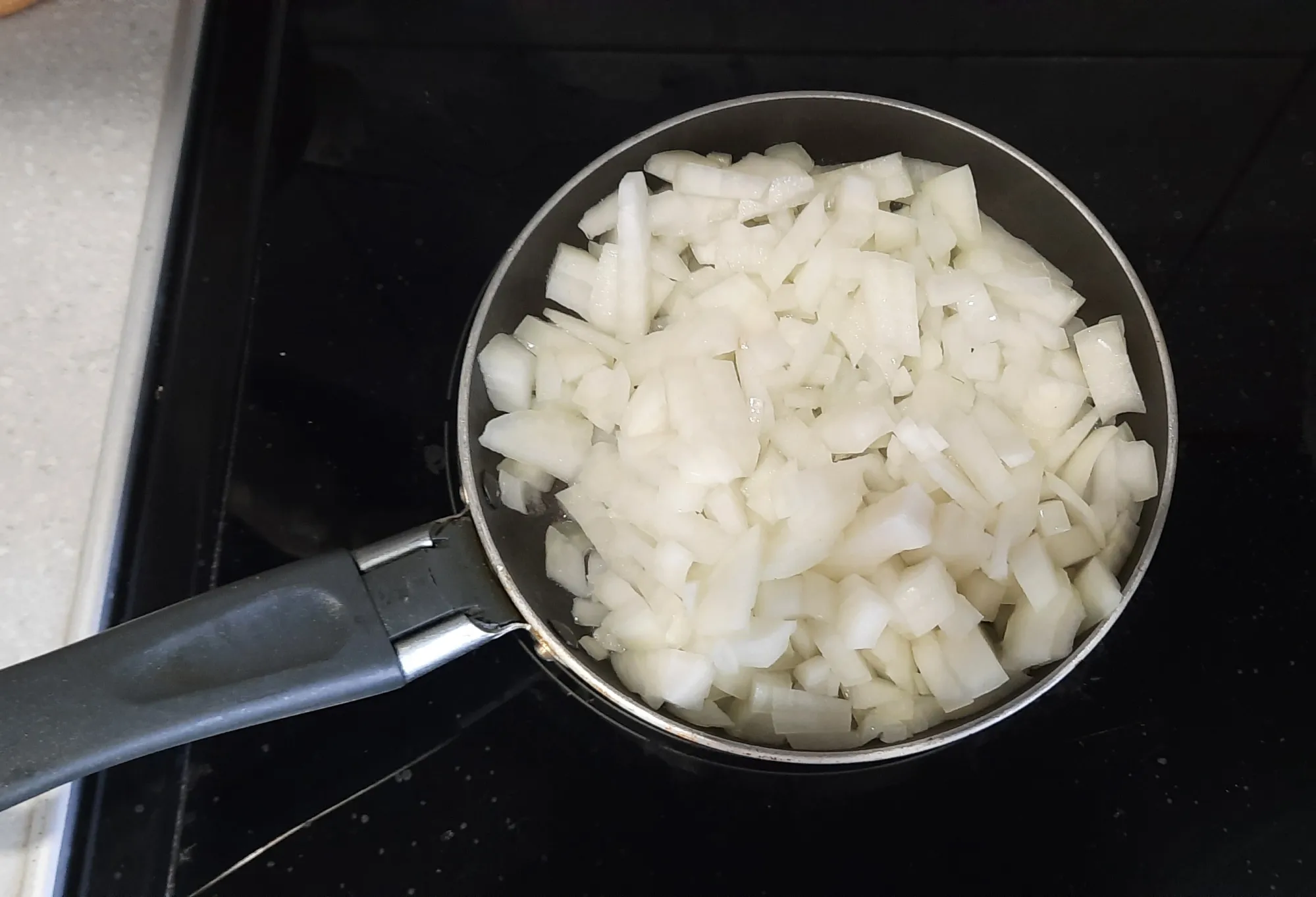 Отправляем лук на маленькую сковороду, сбрызнутую раст. маслом. Попробуем его карамелизовать. Процесс карамелизации лука весьма долгий. Можно поступить некрасиво и добавлять туда воду. Но это признак дурного вкуса у поваров. Так что просто томим его на маленьком огне как можно дольше, периодически помешивая. Тем временем займёмся другими процессами.