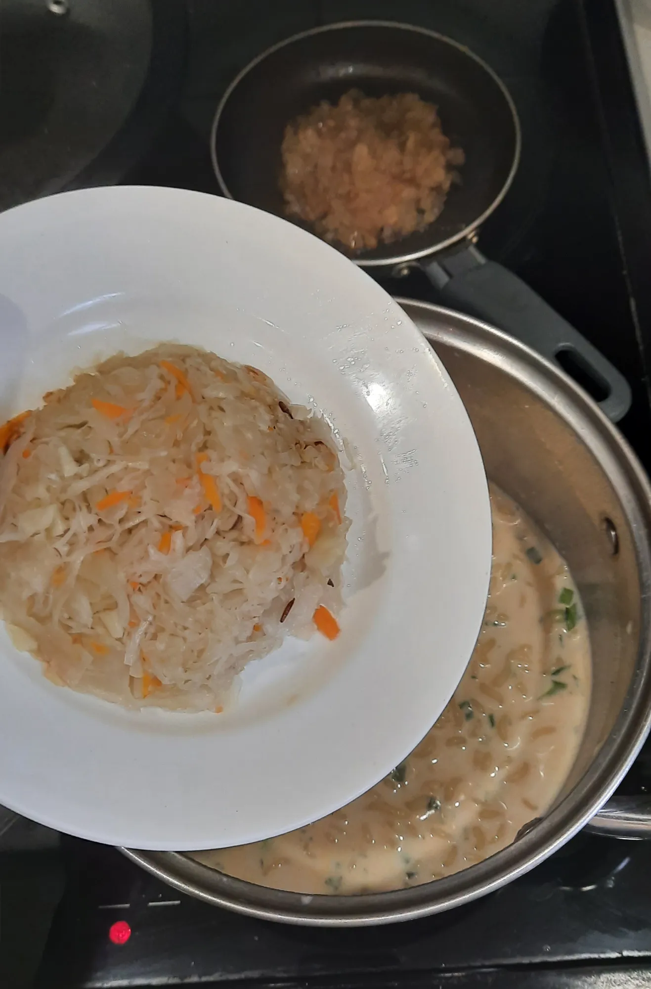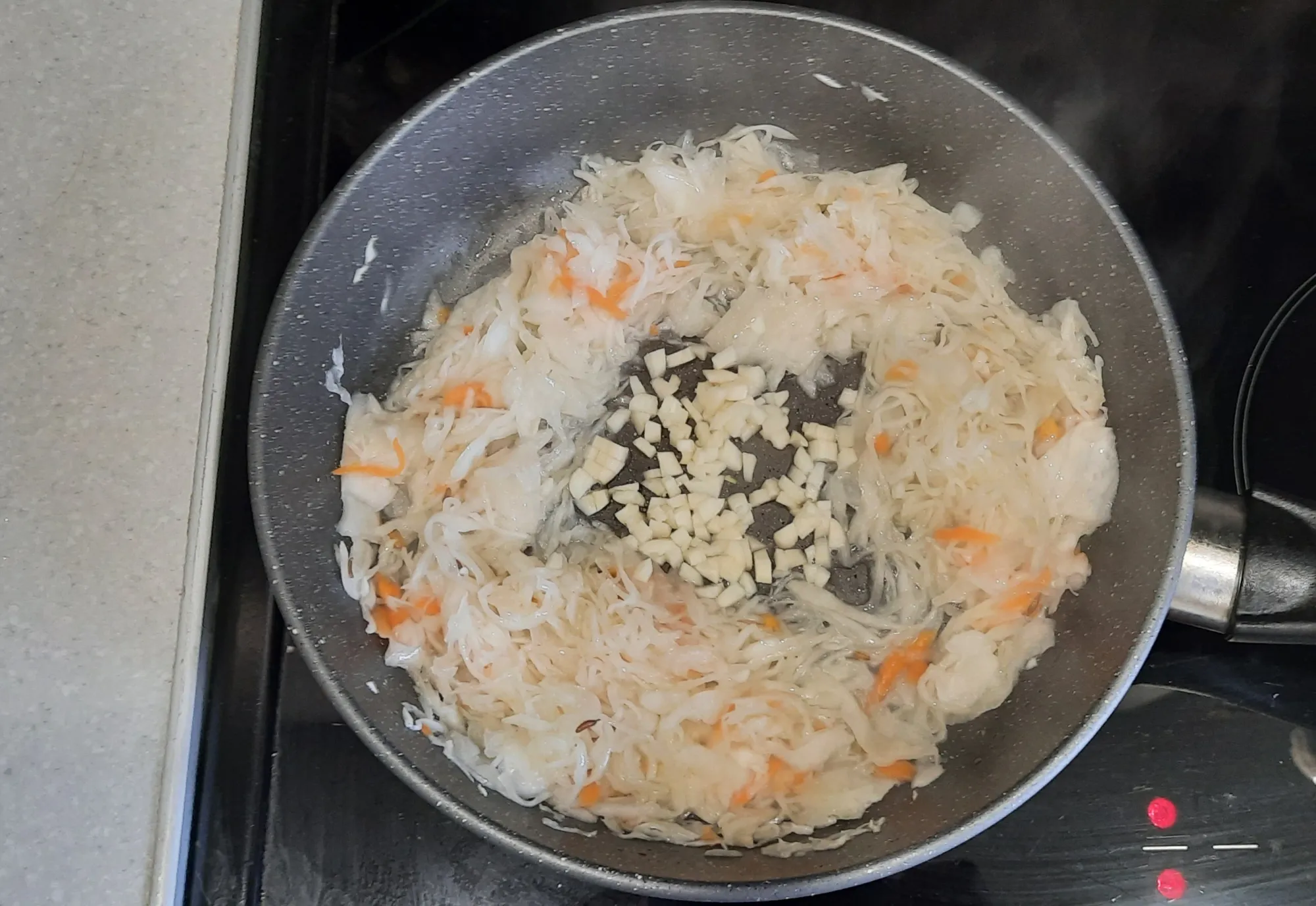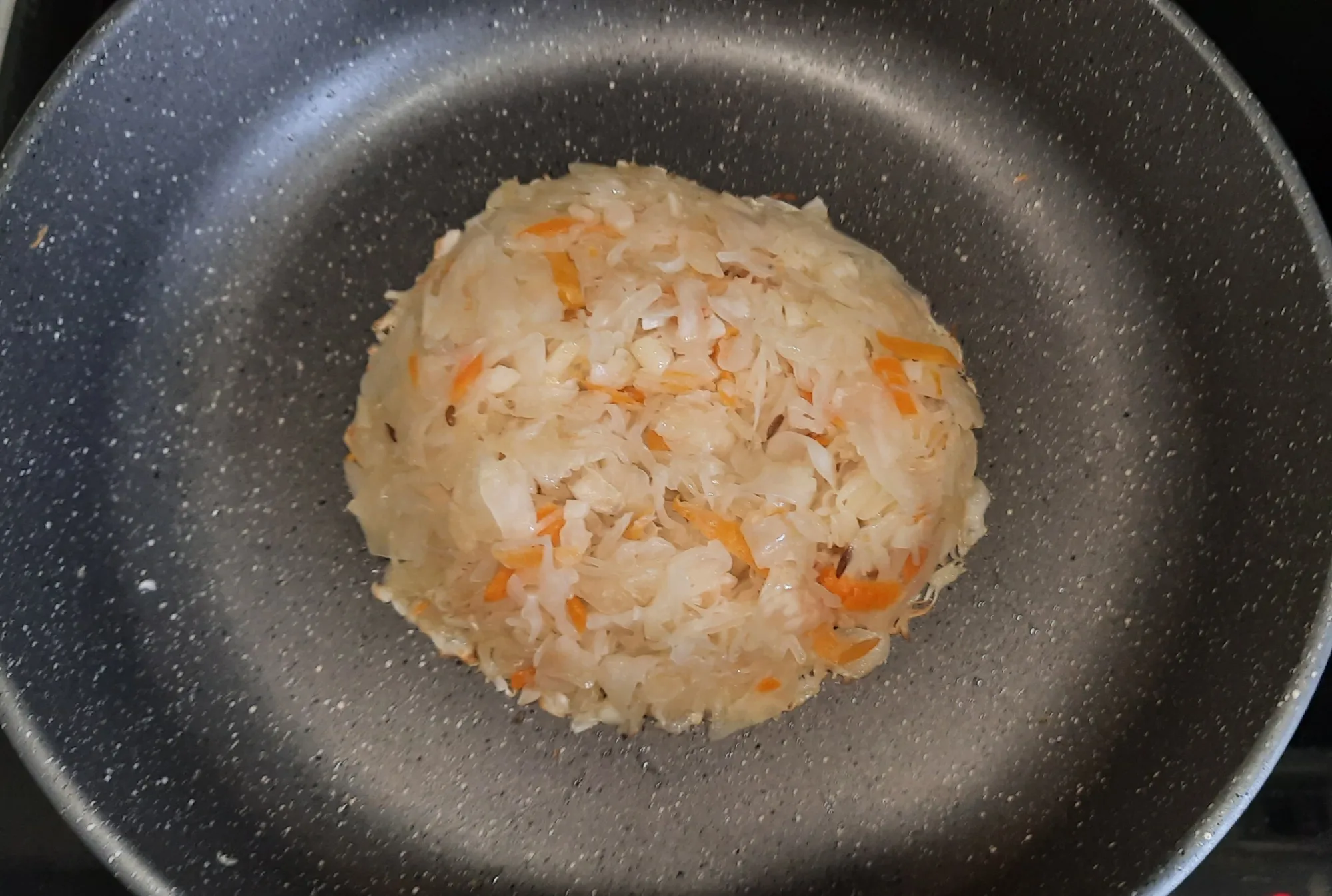 Выключаем огонь, убираем с плиты. Добавляем капусту, карамелизованный лучок (можно пол-ложечки оставить для подачи) и немного селёдки. Без масла!