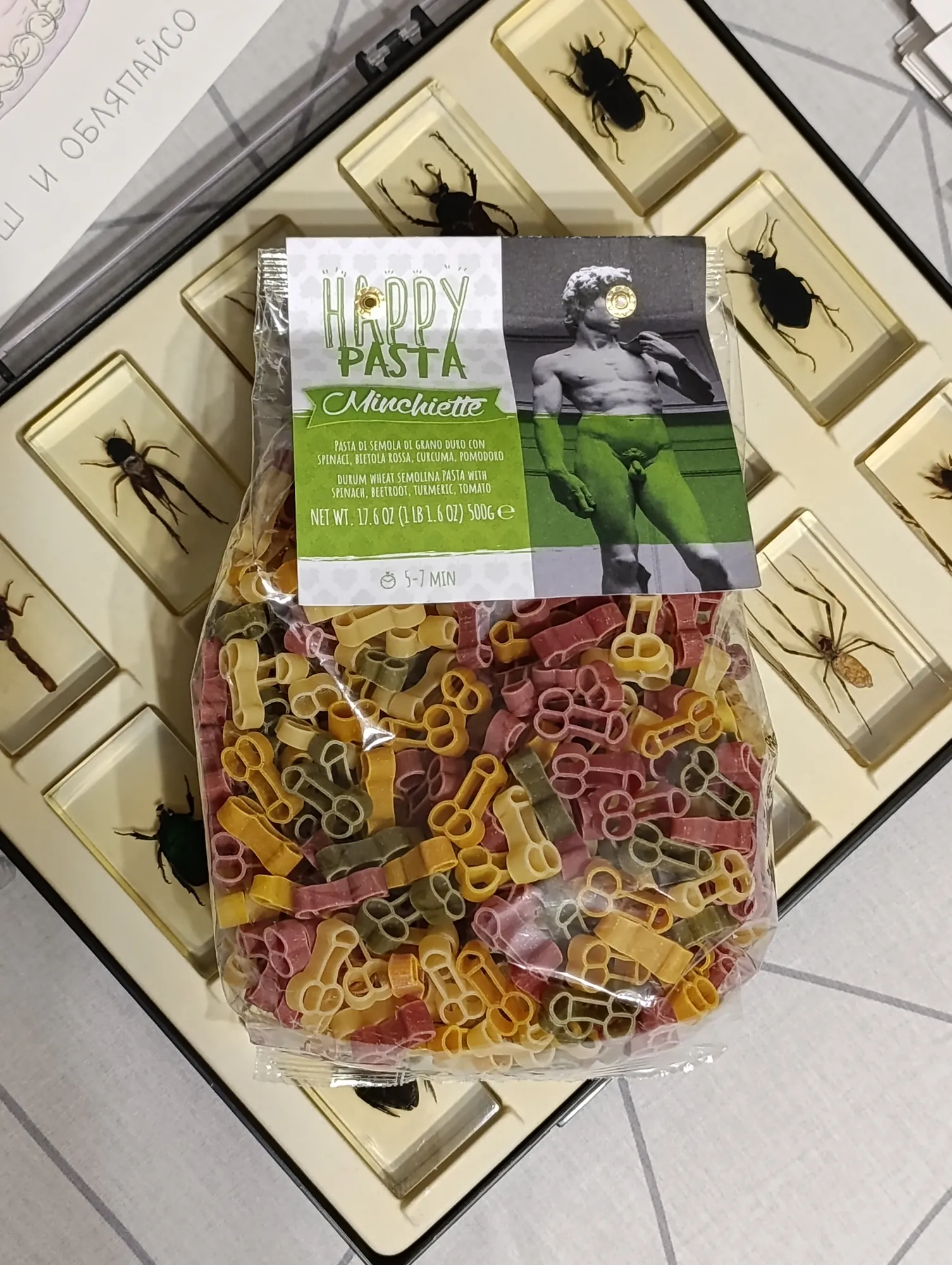 Чуть не забыл. Очень важный предмет. Это очень сильно хуевые макароны. Еще и цветные. Каждая макаронина выполнена в форме хуя разнообразных цветов. Это нечто великолепное. Я уверен, что они будут сожроты сухими. Ибо нехуй варить то, что жрется сухое. Согласны со мной? Вот, я тоже согласен. Это вот прям шедевр. Спасибо за это огромное.