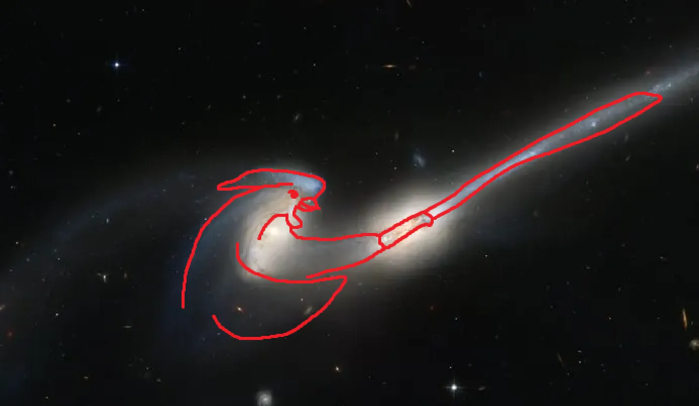 Эту пару, расположенную в 300 миллионах световых лет от нас в созвездии Волосы Вероники, астрономы прозвали «Мыши» — из-за длинных хвостов из звёзд и газа, вытянутых под действием гравитации, как у мышиных хвостиков.