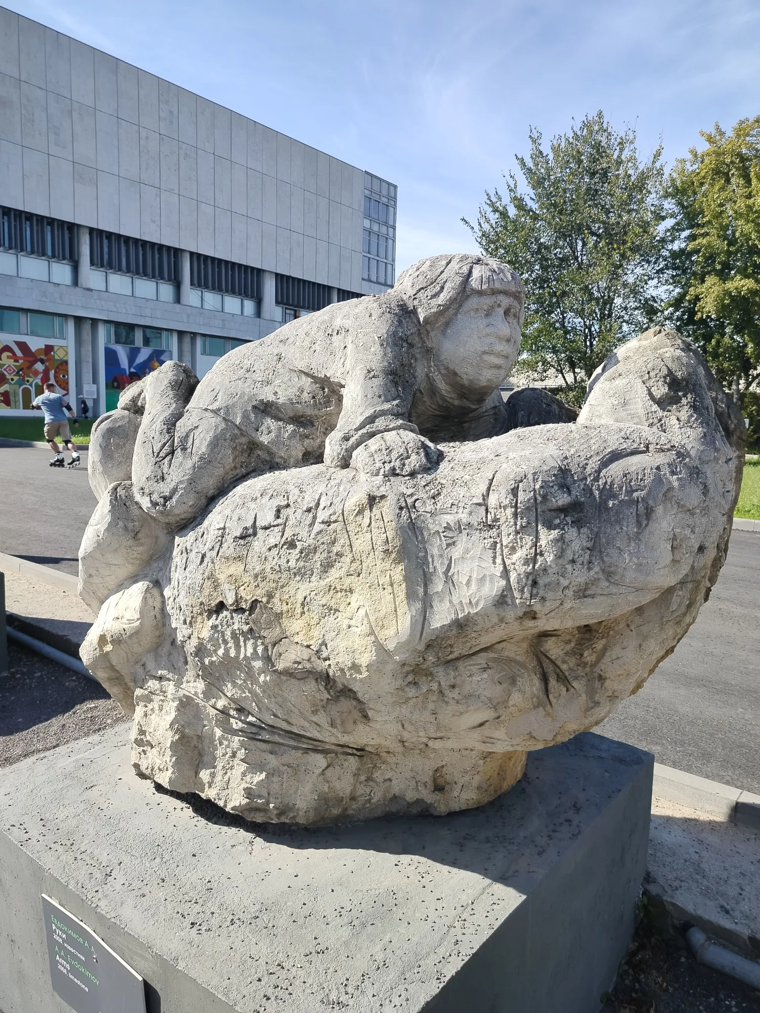 С одной из сторон у здания в парке ещё есть выставка скульптур современных авторов