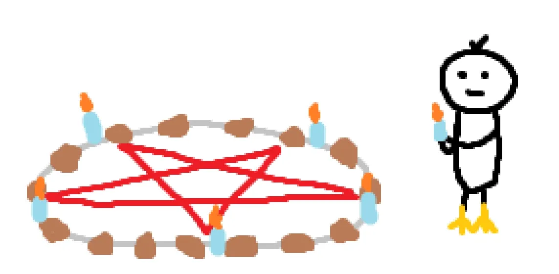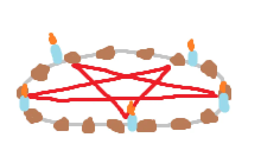 надо нарисовать звезду и обвести вокруг нее круг. у каждого луча звезды поставить свечу. и меня нарисовать справа от пентаграммы.