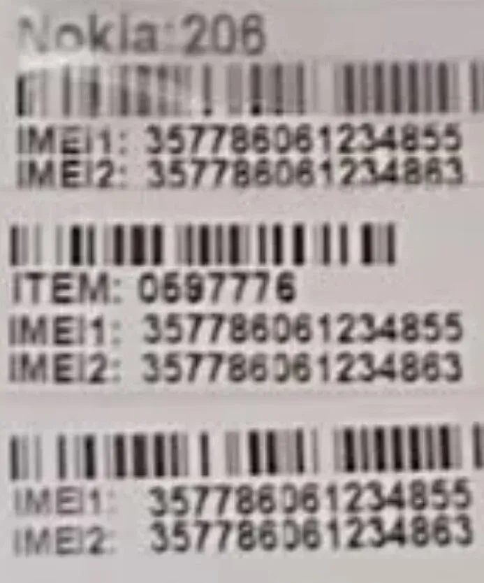 Имей один, зашивается в память на производстве. Сам телефон, вероятно - оригинальная Нокия 206, но откуда взялись неправильные наклейки?... Возможно, телефон был затотален, и перенесли микроэлектронику с одного телефона на другой.