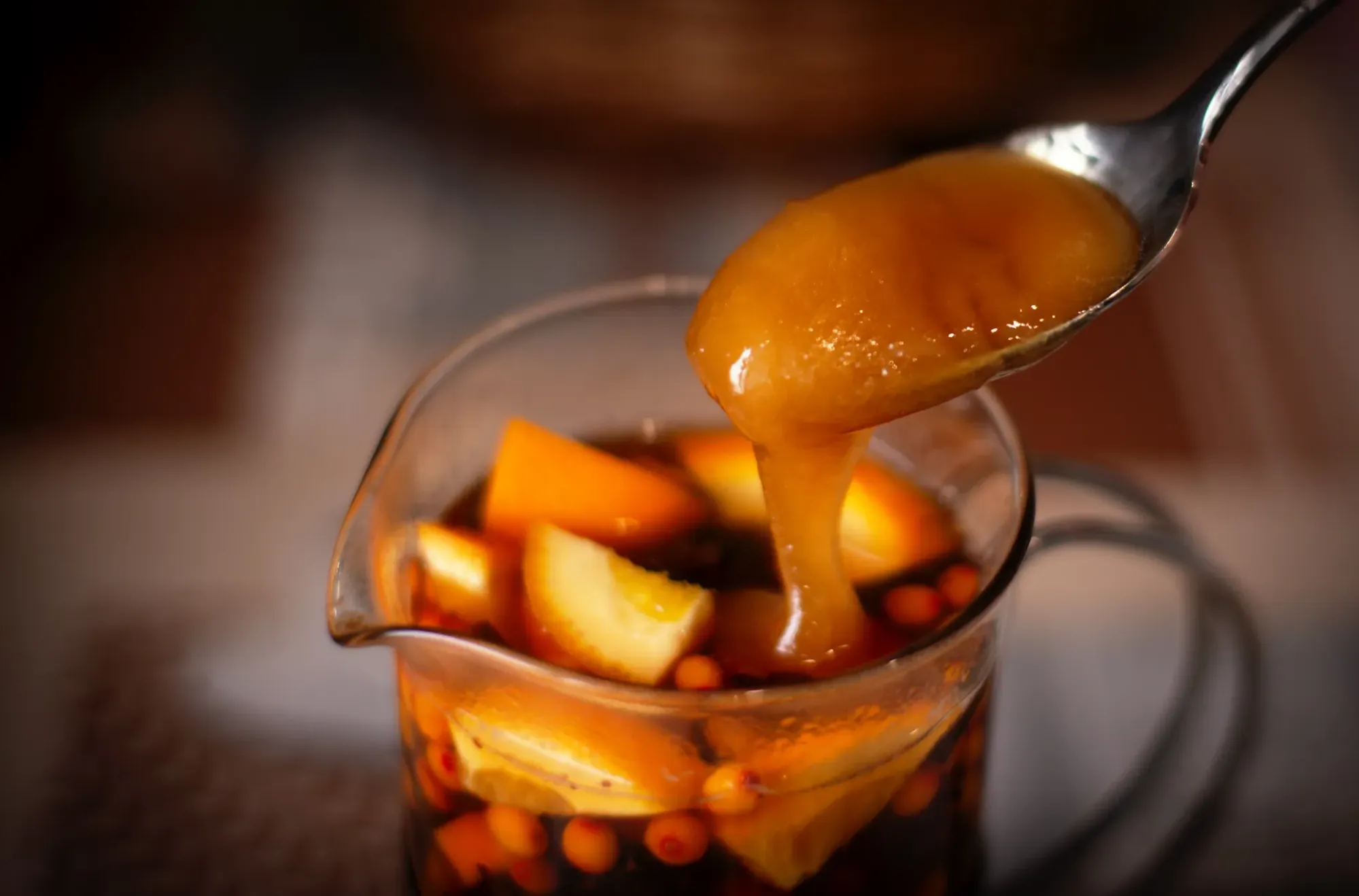 Добавляем ложку мёда. Конечно при попадании в жидкость высокой температурой, мёд все свои целебные свойства потеряет. Но сейчас он нам нужен только для сладости и аромата. Потом можно и вприкуску покушать.