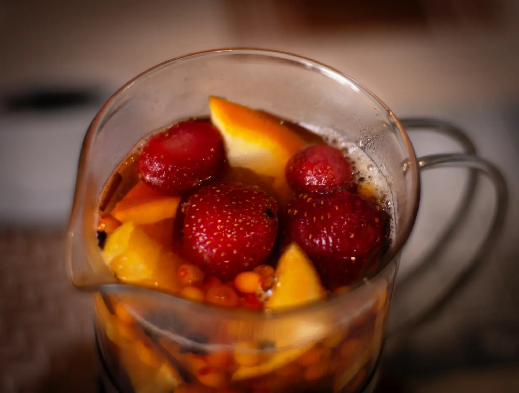 На дно заварника насыпаем чёрный чай и 1/2 столовой ложки сахара, добавляем чёрный перец и гвоздику. Заливаем заварник горячей водой где-то наполовину и ждём около минуты (чтобы чай успел несколько покрепче завариться, перед тем как мы добавим холодные ягоды). Затем добавляем ягоды и мелко резанный апельсин, и доверху заливаем кипятком