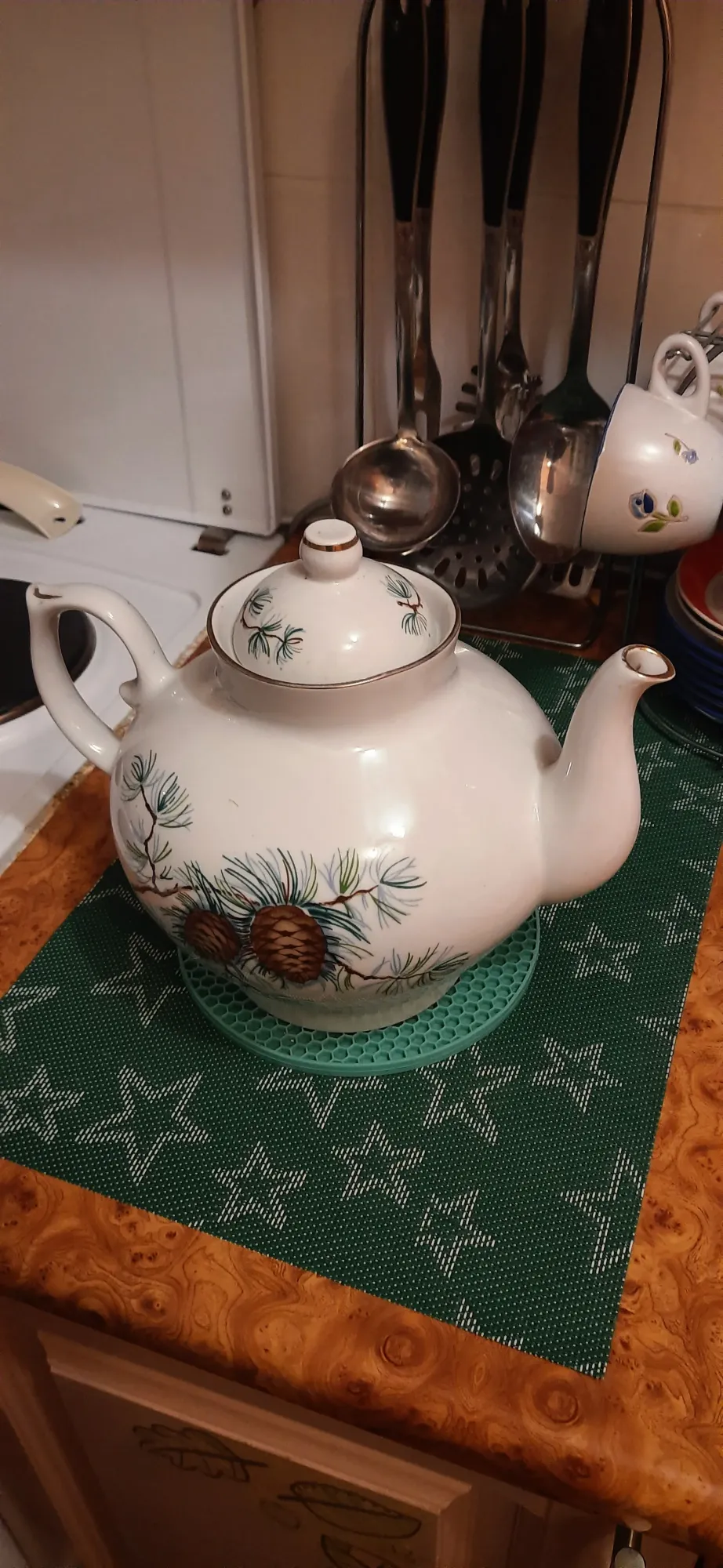 о! касаемо заварничка от бабушки. я уже где-то говорила, кароч в детстве оч любила посуду рассматривать, которая красиво стоит за стеклом. и моей любовью был пузатенький заварник у бабушки в серванте. не помню, расчехляли его они хоть иногда или вообще нет, но он шёл набором с чашечками вроде...но мне был интересен именно он. ну влюбилась я в него.