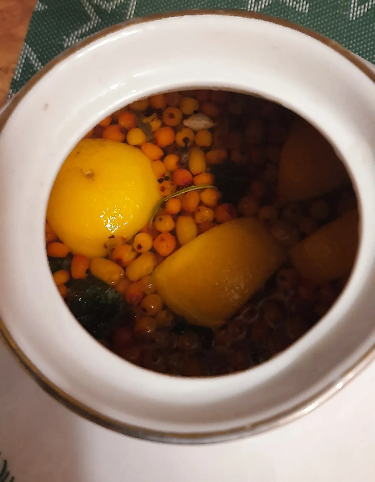 По дороге с прогулки заглянули попроведовать мою старенькую бабушку. У неё нашлось некоторое количество пряностей и сушёных трав. Поэтому прям у неё облепиховый чаёк и заварили. В большом красивом старинном заварнике.