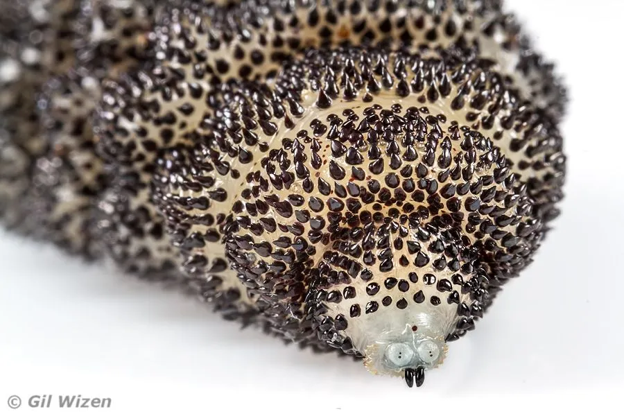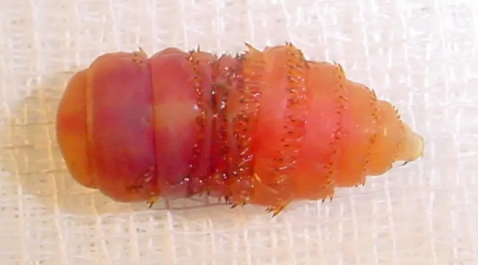 А вот личинка - это квинтэссенция отвращения, размеры которой могут достигать 25 мм, в зависимости от вида. Представьте себе толстого, ребристого, бочкообразного червяка, усеянного рядами крючьев и шипов, а нужны они совсем не для красоты. С их помощью личинка надёжно закрепляется в тканях хозяина, чтобы её не вымыло и не вытолкнуло. Цвет варьируется от грязно-белого до тёмно-коричневого, в зависимости от стадии развития и вида, и эта штука растёт, питаясь твоими тканями или содержимым твоего желудка.