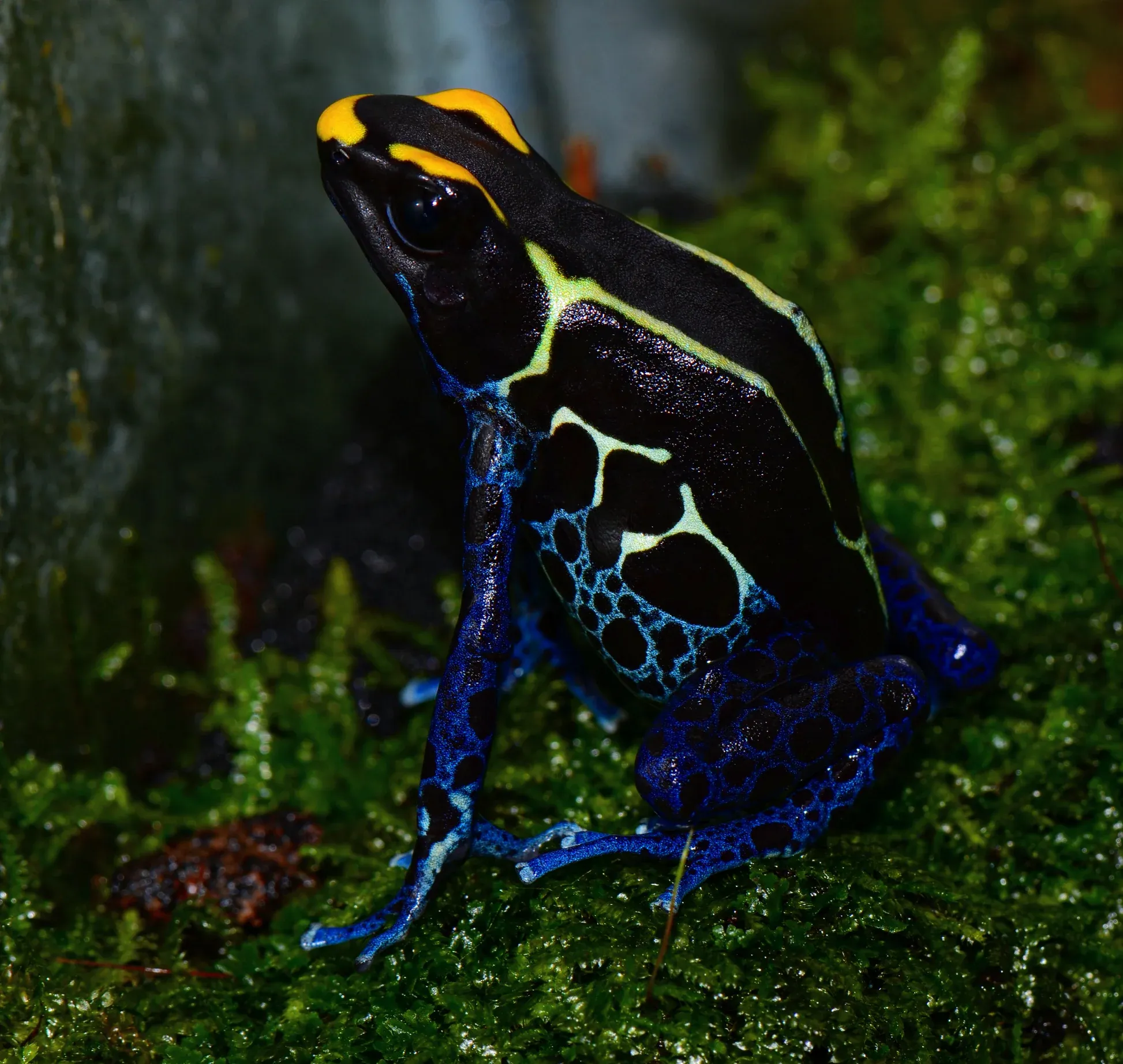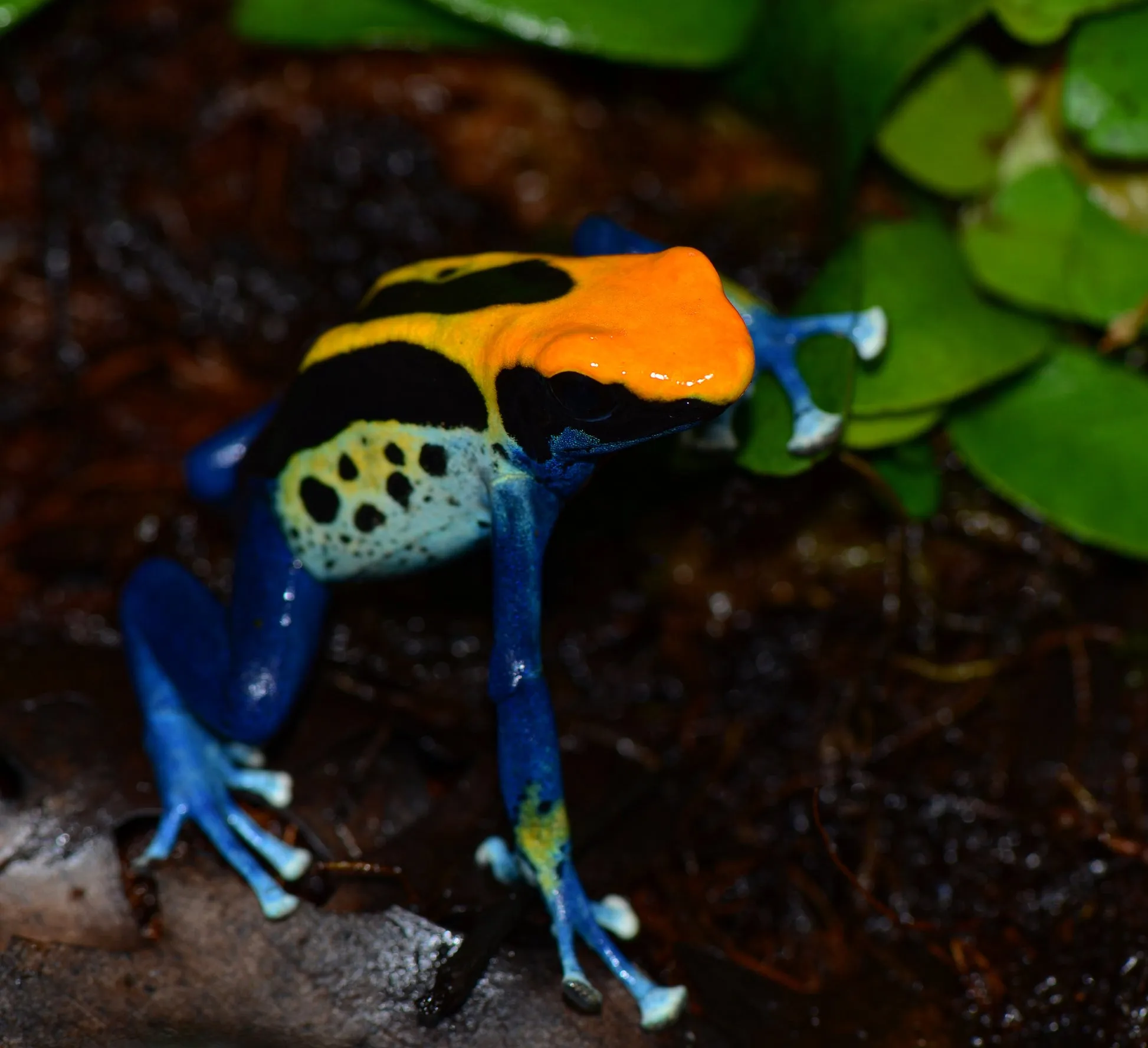 Один из представителей семейства древолазов. Как зачастую бывает у таких ярких лягушек, пятнистый древолаз очень ядовит. В домашних условиях токсичность снижается.