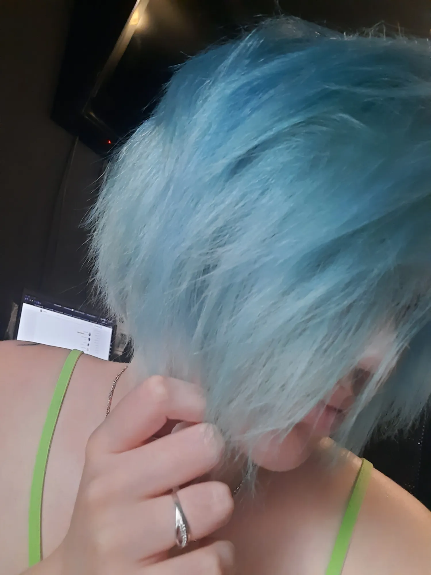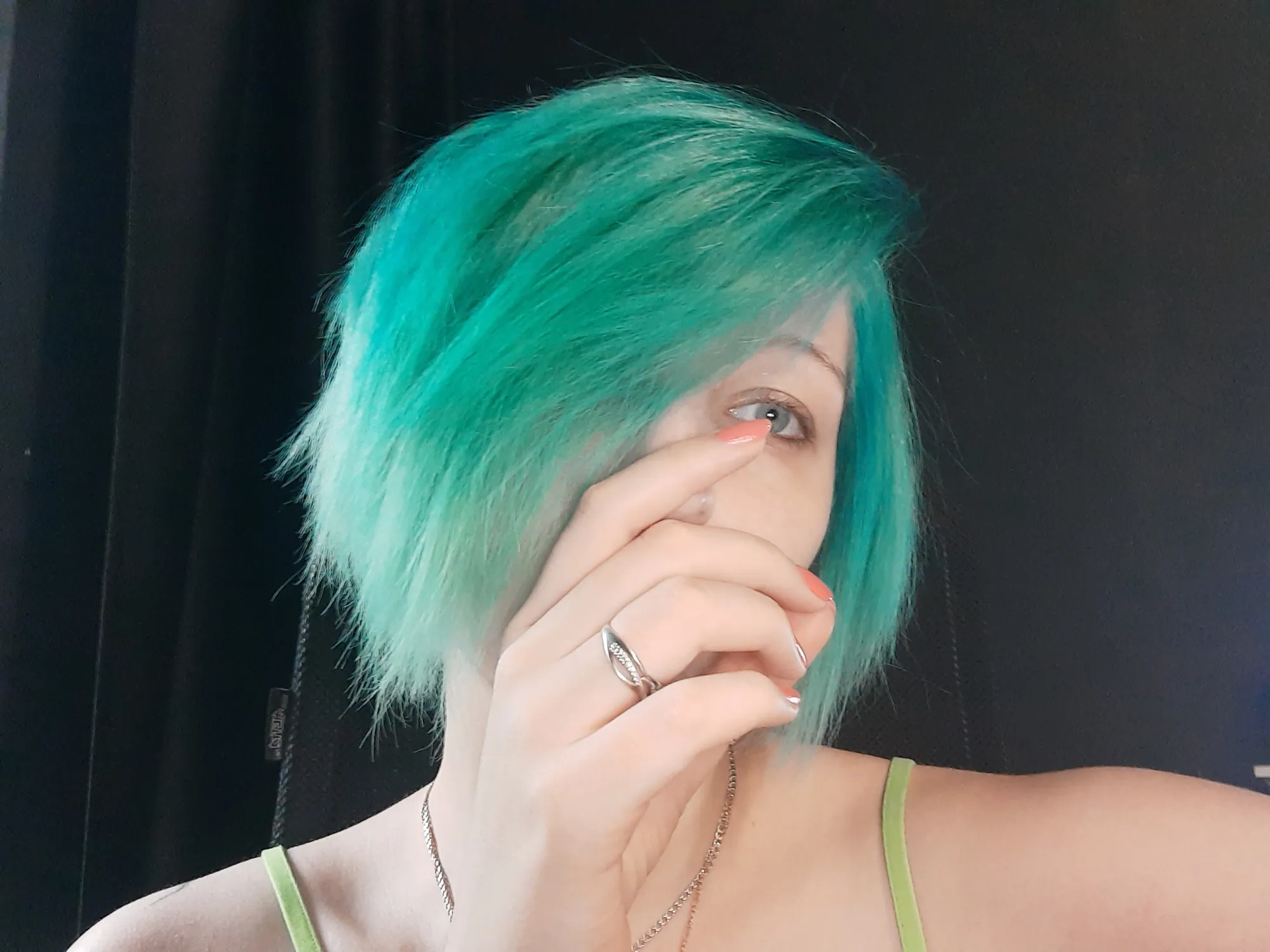 Тут вот, справа что от макушки - прям твой цвет, прям бирюзовый, что на основной причоске - немного в теплый зелёный выбивается-эт не так хорошо, но тут цветокор камеры может быть