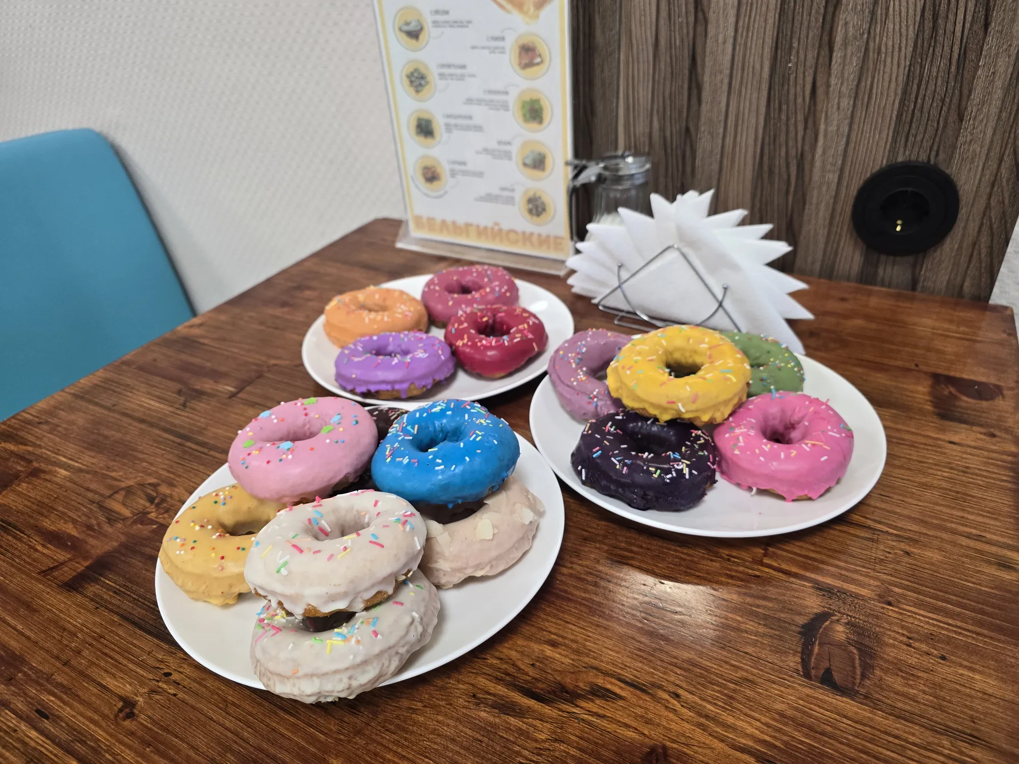 Куча разных пончиков и большой выбор чаёв