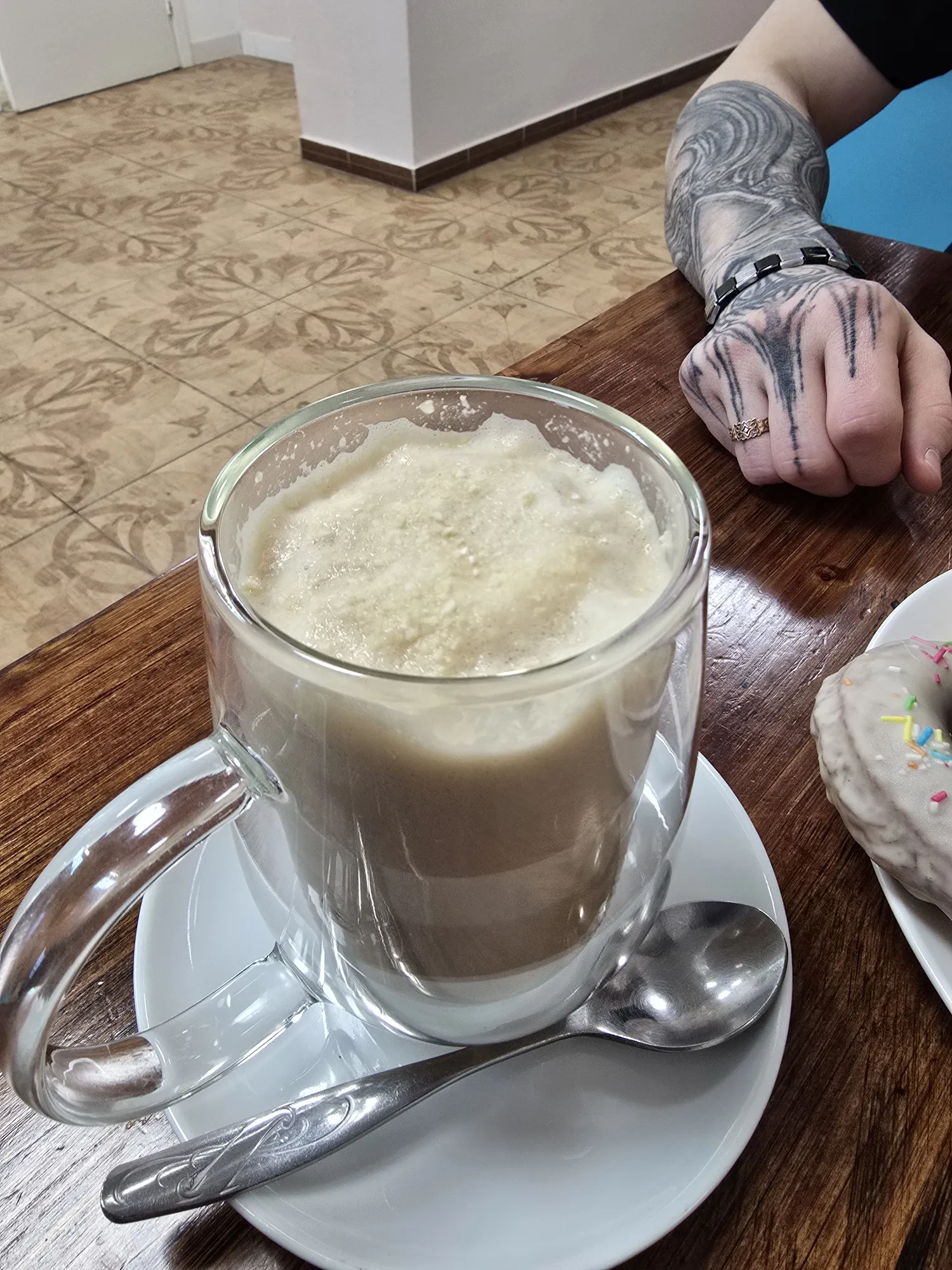 А так как у них акция: за покупку кофе такой пончик дают бесплатно, то нам как раз принесли эти с пылу ещё и халявно.