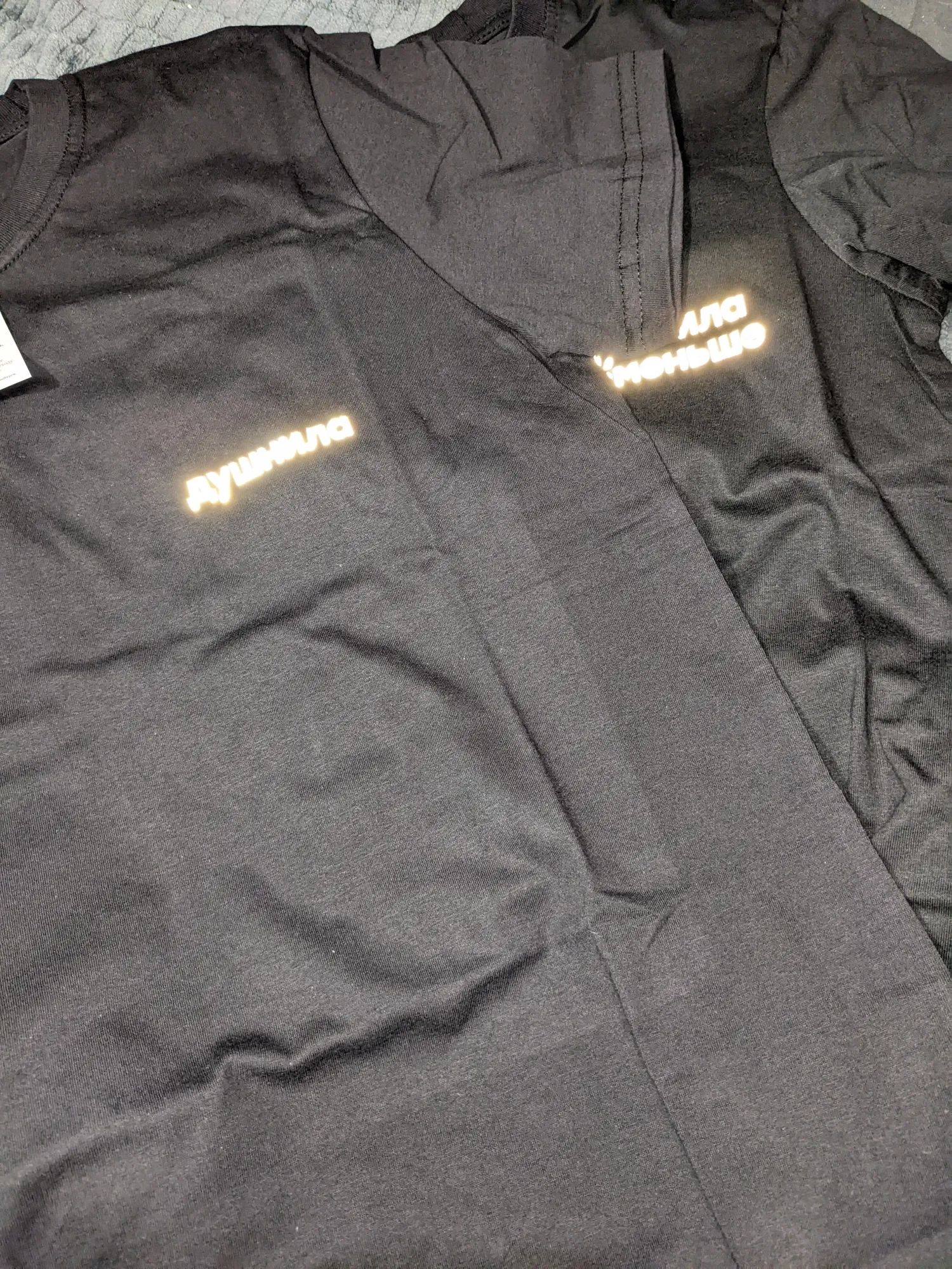 А я друзьям своим дарила на НГ-2023. Душнила и Душнила поменьше. Нормальной фотки не осталось. Это я фотографировала, что мне сделали футболки со светоотражающей надписью, хотя я заказывала обычные. А всё почему? Потому что изначально они размеры наоборот сделали и в итоге в качестве извинений переделали в варианте подороже.