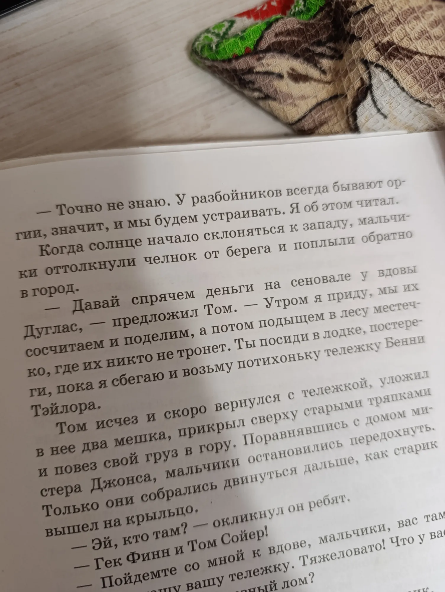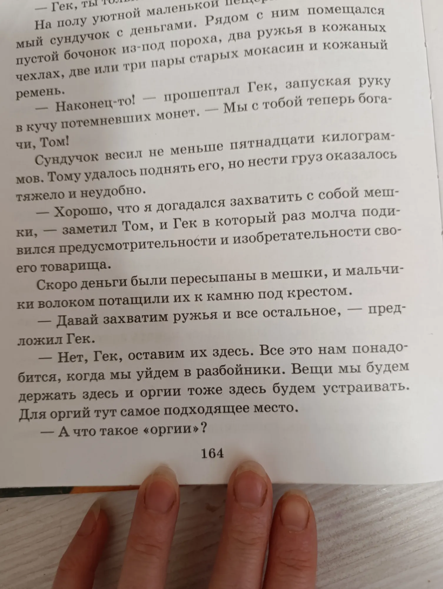 - Нет, Гек, оставим их здесь. Все это нам понадобится, когда мы уйдём в разбойники. Вещи будем держать здесь и оргии тоже здесь будем устраивать. Для оргий самое подходящее место.
