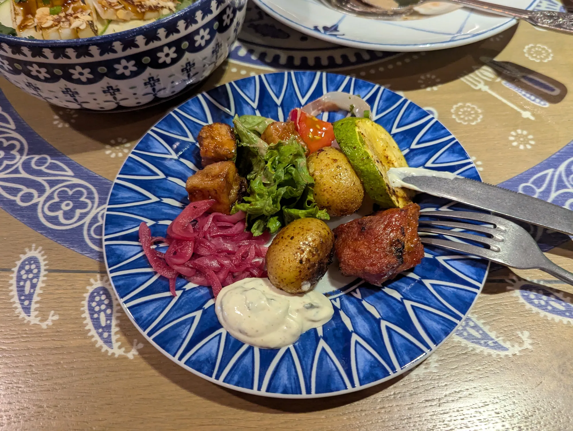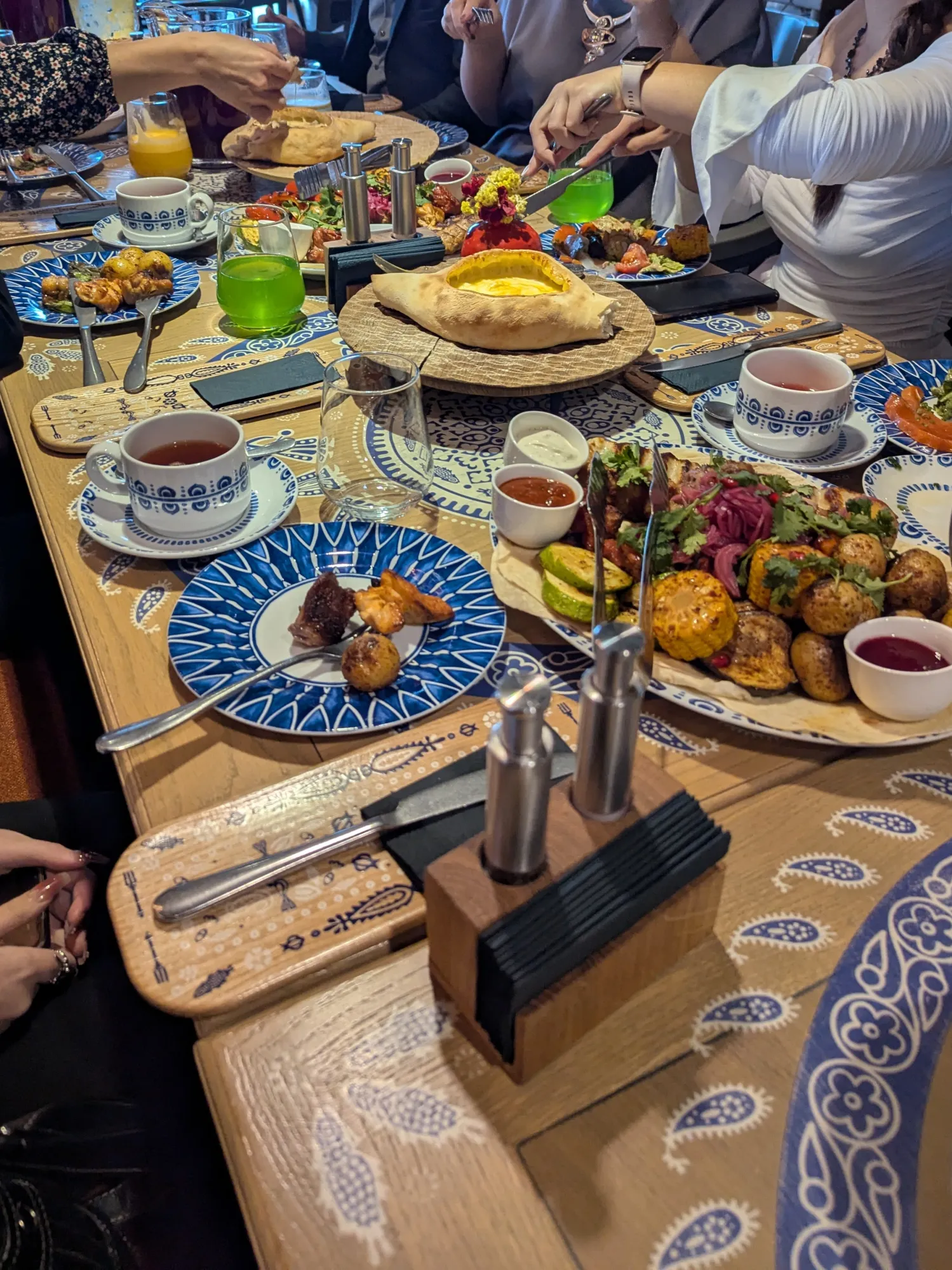 Держи, пару кадров для тебя сделала))) Были салатики с кальмаром, баклажанами в глейзе, цыплёнком. Солёная нерка, муксун. Хачапури с грибами, со страчателлой, классический. Креветки. Сет шашлыков (курица, свинина, баранина) и люля. Курица на гриле. Овощи, картошка.