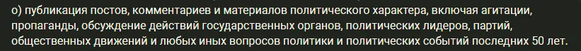 2. На сайте запрещены: о) публикация постов, комментариев и материалов политического характера, включая агитации, пропаганды, обсуждение действий государственных органов, политических лидеров, партий, общественных движений и любых иных вопросов политики и политических событий последних 50 лет.