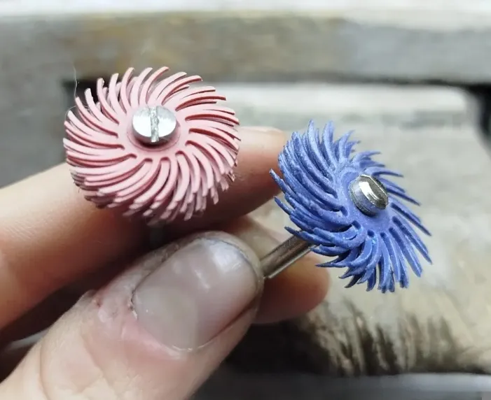 В работе: шлифовка наждак 180/400, полировка грубая фетр, потом коричневая лепестковая резинка (она грубее), отмывка, резинка синяя, фетр, затем финиш на пушке с мелкообразивной пастой, отмывка и родий.